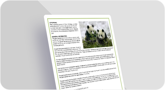OFFSPRING: After a gestation period of 125 to 150 days, a mother panda gives birth to one or two young, but only one survives. Eyes open at six to eight weeks, and the cub starts to move around at three months. Weaned at six months, the cub becomes independent after a year. GENERAL INFORMATION: The giant panda lives in mountainous regions, such as Sichuan and Tibet. Since the latter half of the 20th century, the panda has become an informal national emblem for China, and its image is found on many Chinese gold coins. Despite being taxonomically a carnivore, the panda has a diet that is overwhelmingly herbivorous. The giant panda eats shoots and leaves, living almost entirely on bamboo. Pandas are also known to eat eggs, the occasional fish, and some insects along with their bamboo diet. These are necessary sources of protein. Like other subtropical mammals, the giant panda does not hibernate. For many decades the precise taxonomic classification of the panda was under debate as both the giant panda and the distantly related red panda share characteristics of both bears and raccoons. However, genetic testing seems to have revealed that giant pandas are true bears and part of the Ursidae family. Its closest bear relative is the Spectacled Bear of South America. Giant pandas are an endangered species, threatened by continued habitat loss and by a very low birthrate, both in the wild and in captivity. Poaching is uncommon; killing a panda was punishable in China by death until a 1997 law changed the penalty to 20 years imprisonment. The giant panda has an unusual paw, with a "thumb" and five fingers; the "thumb" is actually a modified sesamoid bone. The giant panda has a short tail, approximately 15 cm long. The giant panda has long been a favorite of the public, at least partly on account of the fact that the species has an appealing baby like cuteness that makes it seem to resemble a living teddy bear. The fact that it is usually depicted reclining peacefully eating bamboo, as opposed to hunting, also adds to its image of innocence. Though the giant panda is often assumed docile because of their cuteness, they have been known to attack humans, usually assumed to be out of irritation rather than predatory behavior. Giant pandas can usually live to be 20 30 years old. THREATS: Habitat loss to increasing human populations; poaching; periodic bamboo die-offs. CAPTIVITY: While zoos and aquariums may appear to be educational and conservation-oriented, most are designed with the needs and desires of the visitors in mind, not the needs of the animals. Many animals in zoos and aquariums exhibit abnormal behavior as a result of being deprived of their natural environments and social structures. Some zoos and aquariums do rescue some animals and work to save endangered species, but most animals in zoos were either captured from the wild or bred in captivity for the purpose of public display, not species protection. The vast majority of captive-bred animals will never be returned to the wild. When the facility breeds too many animals they become "surplus" and often are sold to laboratories, traveling shows, shooting ranches, or to private individuals who may be unqualified to care for them. PROTECTION: *Cites Appendix I, Endangered Species Act *Convention on International Trade in Endangered Species of Wild Fauna and Flora, an international treaty with more than 144 member countries. Appendix I listed species cannot be traded commercially. Appendix II listed species can be traded commercially only if it does not harm their survival.