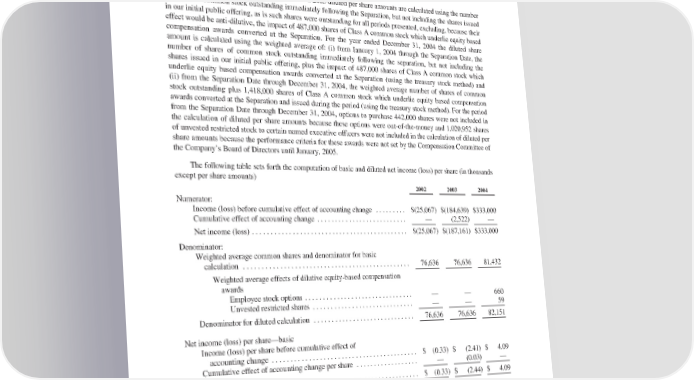 DREAMWORKSANIMATIONSKG,INC. NOTESTOCONSOLIDATEDFINANCIALSTATEMENTS—(Continued) outstanding for the entire period and (ii) from the Separation Date through December 31, 2004, the weighted average number of shares of common stock outstanding. For the years ended December 31, 2002 and 2003 diluted per share amounts are calculated using the number of shares of common stock outstanding immediately following the Separation, but not including the shares issued in our initial public offering, as is such shares were outstanding for all periods presented, excluding, because their effect would be anti-dilutive, the impact of 487,000 shares of Class A common stock which underlie equity based compensation awards converted at the Separation. For the year ended December 31, 2004 the diluted share amount is calculated using the weighted average of: (i) from January 1, 2004 through the Separation Date, the number of shares of common stock outstanding immediately following the separation, but not including the shares issued in our initial public offering, plus the impact of 487,000 shares of Class A common stock which underlie equity based compensation awards converted at the Separation (using the treasury stock method) and (ii) from the Separation Date through December 31, 2004, the weighted average number of shares of common stock outstanding plus 1,418,000 shares of Class A common stock which underlie equity based compensation awards converted at the Separation and issued during the period (using the treasury stock method). For the period from the Separation Date through December 31, 2004, options to purchase 442,000 shares were not included in the calculation of diluted per share amounts because these options were out-of-the-money and 1,020,952 shares of unvested restricted stock to certain named executive officers were not included in the calculation of diluted per share amounts because the performance criteria for these awards were not set by the Compensation Committee of the Company’s Board of Directors until January, 2005. The following table sets forth the computation of basic and diluted net income (loss) per share (in thousands except per share amounts) 2002 2003 2004 Numerator: Income (loss) before cumulative effect of accounting change ......... $(25,067) $(184,639) $333,000 Cumulative effect of accounting change .......................... — (2,522) — Net income (loss) ............................................ $(25,067) $(187,161) $333,000 Denominator: Weighted average common shares and denominator for basic calculation ............................................... 76,636 76,636 81,432 Weighted average effects of dilutive equity-based compensation awards Employee stock options ............................... — — 660 Unvested restricted shares ............................. — — 59 Denominator for diluted calculation ............................. 76,636 76,636 82,151 Net income (loss) per share—basic Income (loss) per share before cumulative effect of accounting change ......................................... $ (0.33) $ (2.41) $ 4.09 Cumulative effect of accounting change per share .................. — (0.03) — Net income (loss) per share .................................... $ (0.33) $ (2.44) $ 4.09 Net income (loss) per share—diluted Income (loss) per share before cumulative effect of accounting change .................................................. $ (0.33) $ (2.41) $ 4.05 Cumulative effect of accounting change per share .................. — (0.03) — Net income (loss) per share .................................... $ (0.33) $ (2.44) $ 4.05 95