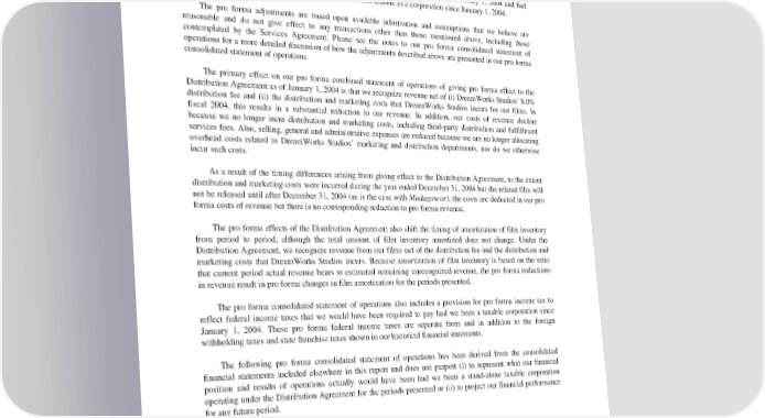 PROFORMAFINANCIALINFORMATION The following pro forma financial information should be read in conjunction with “Item 7—Management’s Discussion and Analysis of Financial Condition and Results of Operations” and our consolidated financial statements and the notes thereto included elsewhere in this report. The pro forma consolidated statement of operations was prepared (i) as if the Distribution Agreement had become effective on January 1, 2004 and had been in effect in all periods since and (ii) as if we had been taxable as a corporation since January 1, 2004. The pro forma adjustments are based upon available information and assumptions that we believe are reasonable and do not give effect to any transactions other than those mentioned above, including those contemplated by the Services Agreement. Please see the notes to our pro forma consolidated statement of operations for a more detailed discussion of how the adjustments described above are presented in our pro forma consolidated statement of operations. The primary effect on our pro forma combined statement of operations of giving pro forma effect to the Distribution Agreement as of January 1, 2004 is that we recognize revenue net of (i) DreamWorks Studios’ 8.0% distribution fee and (ii) the distribution and marketing costs that DreamWorks Studios incurs for our films. In fiscal 2004, this results in a substantial reduction to our revenue. In addition, our costs of revenue decline because we no longer incur distribution and marketing costs, including third-party distribution and fulfillment services fees. Also, selling, general and administrative expenses are reduced because we are no longer allocating overhead costs related to DreamWorks Studios’ marketing and distribution departments, nor do we otherwise incur such costs. As a result of the timing differences arising from giving effect to the Distribution Agreement, to the extent distribution and marketing costs were incurred during the year ended December 31, 2004 but the related film will not be released until after December 31, 2004 (as is the case with Madagascar), the costs are deducted in our pro forma costs of revenue but there is no corresponding reduction to pro forma revenue. The pro forma effects of the Distribution Agreement also shift the timing of amortization of film inventory from period to period, although the total amount of film inventory amortized does not change. Under the Distribution Agreement, we recognize revenue from our films net of the distribution fee and the distribution and marketing costs that DreamWorks Studios incurs. Because amortization of film inventory is based on the ratio that current period actual revenue bears to estimated remaining unrecognized revenue, the pro forma reductions in revenue result in pro forma changes in film amortization for the periods presented. The pro forma consolidated statement of operations also includes a provision for pro forma income tax to reflect federal income taxes that we would have been required to pay had we been a taxable corporation since January 1, 2004. These pro forma federal income taxes are separate from and in addition to the foreign withholding taxes and state franchise taxes shown in our historical financial statements. The following pro forma consolidated statement of operations has been derived from the consolidated financial statements included elsewhere in this report and does not purport (i) to represent what our financial position and results of operations actually would have been had we been a stand-alone taxable corporation operating under the Distribution Agreement for the periods presented or (ii) to project our financial performance for any future period. 44