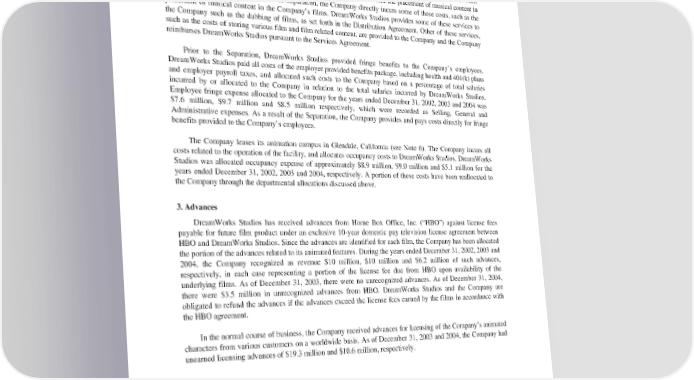 DREAMWORKSANIMATIONSKG,INC. NOTESTOCONSOLIDATEDFINANCIALSTATEMENTS—(Continued) Other Allocations: The Company historically has been allocated certain other costs, including (1) costs to track, deliver and store various film and film related content (for example, film elements, photos and artwork); (2) costs to oversee dubbing of the Company’s films and (3) costs to oversee the placement of musical content in the Company’s films. As a result of the Separation, the Company directly incurs some of these costs, such as the placement of musical content in the Company’s films. DreamWorks Studios provides some of these services to the Company such as the dubbing of films, as set forth in the Distribution Agreement. Other of these services, such as the costs of storing various film and film related content, are provided to the Company and the Company reimburses DreamWorks Studios pursuant to the Services Agreement. Prior to the Separation, DreamWorks Studios provided fringe benefits to the Company’s employees. DreamWorksStudios paid all costs of the employer provided benefits package, including health and 401(k) plans and employer payroll taxes, and allocated such costs to the Company based on a percentage of total salaries incurred by or allocated to the Company in relation to the total salaries incurred by DreamWorks Studios. Employee fringe expense allocated to the Company for the years ended December 31, 2002, 2003 and 2004 was $7.6 million, $9.7 million and $8.5 million respectively, which were recorded as Selling, General and Administrative expenses. As a result of the Separation, the Company provides and pays costs directly for fringe benefits provided to the Company’s employees. The Company leases its animation campus in Glendale, California (see Note 6). The Company incurs all costs related to the operation of the facility, and allocates occupancy costs to DreamWorks Studios. DreamWorks Studios was allocated occupancy expense of approximately $8.9 million, $9.0 million and $5.1 million for the years ended December 31, 2002, 2003 and 2004, respectively. A portion of these costs have been reallocated to the Company through the departmental allocations discussed above. 3. Advances DreamWorks Studios has received advances from Home Box Office, Inc. (“HBO”) against license fees payable for future film product under an exclusive 10-year domestic pay television license agreement between HBOandDreamWorksStudios. Since the advances are identified for each film, the Company has been allocated the portion of the advances related to its animated features. During the years ended December 31, 2002, 2003 and 2004, the Company recognized as revenue $10 million, $10 million and $6.2 million of such advances, respectively, in each case representing a portion of the license fee due from HBO upon availability of the underlying films. As of December 31, 2003, there were no unrecognized advances. As of December 31, 2004, there were $3.5 million in unrecognized advances from HBO. DreamWorks Studios and the Company are obligated to refund the advances if the advances exceed the license fees earned by the films in accordance with the HBOagreement. In the normal course of business, the Company received advances for licensing of the Company’s animated characters from various customers on a worldwide basis. As of December 31, 2003 and 2004, the Company had unearned licensing advances of $19.3 million and $10.6 million, respectively. 82
