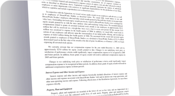 will not include distribution and marketing costs and third-party distribution and fulfillment services fees. Our revenue will also be lower because it will be net of the distribution and marketing costs that DreamWorks Studios recoups, as well as its 8.0% distribution fee. Selling, General and Administrative Expenses Selling, general and administrative expenses generally consist of general and administrative expenses, including allocations (historically), depreciation and non-film amortization, net of expenses included in capitalized overhead. General and administrative expenses consist of salaries, rent and other allocated overhead costs as described in allocations above. Capitalized overhead generally represents the salaries of individual employees or entire departments with exclusive or significant responsibilities for the production of our films, which we capitalize and include in production costs as described above. In connection with the Separation, we issued various equity awards to our employees and advisors, as well as to employees of DreamWorks Studios as described below. We issued fully vested shares to our and DreamWorksStudios’ employees who had fully vested awards granted by DreamWorks Studios on an equivalent value basis. Outstanding unvested equity awards previously issued by DreamWorks Studios were exchanged for equity awards granted by us with the same intrinsic value and remaining vesting terms. We recorded deferred compensation related to grants of unvested restricted stock awards to our employees of approximately $33.2 million that will be amortized on a straight-line basis over a four to seven year period. Of this amount, $1.0 million was amortized to expense in the fourth quarter of 2004. In addition, we issued fully vested stock to certain of our employees and advisors upon the consummation of our initial public offering, and recorded an expense of $20.0 million during the fourth quarter of 2004. We accounted for the vested and unvested equity awards granted to employees of DreamWorks Studios as a dividend to DreamWorks Studios of $31.9 million determined based on the fair value of the awards at the date of grant. In addition, as of January 1, 2005, we began expensing all unvested stock options. We currently estimate that our compensation expense for the year ended December 31, 2005 will be approximately $25.0 million for equity awards granted to date. Changes to our underlying stock price or satisfaction of performance criteria could significantly impact compensation expense to be recognized in 2005 and future periods. In addition, future grants of equity awards will result in additional compensation expense in 2005 and future periods. Changes to our underlying stock price or satisfaction of performance criteria could significantly impact compensation expense to be recognized in future periods. In addition, future grants of equity awards will result in additional compensation expense in future periods. Interest Expense and Other Income and Expense Interest expense and other income and expense historically included allocations of interest expense and other income and expense associated with DreamWorks Studios’ debt and its interest rate swap agreements, and other non-operating income and expense. Following effectiveness of the Distribution Agreement, we incur these expenses directly. Property, Plant and Equipment Property, plant and equipment are recorded at the lower of cost or fair value and are depreciated on a straight-line method over the estimated useful lives of such assets. Property, plant and equipment consist primarily of our Glendale animation campus, leasehold improvements associated with our Redwood City facility, furniture and computer equipment. Provision for Income Taxes Prior to the Separation, DreamWorks Studios paid no federal income taxes as an entity as the operations of DreamWorks Studios were included in the taxable income of its individual members. The tax expense in our 55