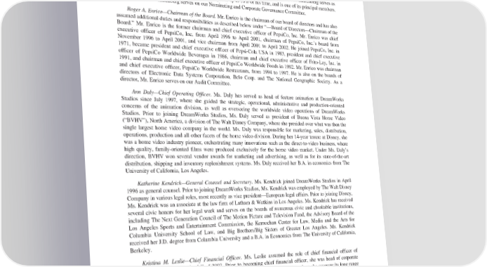 Prior to joining Disney, Mr. Katzenberg was president of Paramount Studios. Mr. Katzenberg serves on the boards of The Motion Picture and Television Fund, The Museum of Moving Image, Cedars-Sinai Medical Center, California Institute of the Arts and The Simon Wiesenthal Center. He is co-chairman of each of the Creative Rights Committee of the Directors Guild of America, and the Committee on the Professional Status of Writers of the Writers Guild of America. In addition, his fundraising efforts on behalf of AIDS Project Los Angeles have helped to provide its clients with medical and social services. In addition, Mr. Katzenberg serves as a consultant to DreamWorks Studios, where he spends up to 10% of his time, and is one of its principal members. Asadirector, Mr. Katzenberg serves on our Nominating and Corporate Governance Committee. Roger A. Enrico—Chairman of the Board. Mr. Enrico is the chairman of our board of directors and has also assumed additional duties and responsibilities as described below under “—Board of Directors—Chairman of the Board.” Mr. Enrico is the former chairman and chief executive officer of PepsiCo, Inc. Mr. Enrico was chief executive officer of PepsiCo, Inc. from April 1996 to April 2001, chairman of PepsiCo, Inc.’s board from November 1996 to April 2001, and vice chairman from April 2001 to April 2002. He joined PepsiCo, Inc. in 1971, became president and chief executive officer of Pepsi-Cola USA in 1983, president and chief executive officer of PepsiCo Worldwide Beverages in 1986, chairman and chief executive officer of Frito-Lay, Inc. in 1991, and chairman and chief executive officer of PepsiCo Worldwide Foods in 1992. Mr. Enrico was chairman and chief executive officer, PepsiCo Worldwide Restaurants, from 1994 to 1997. He is also on the boards of directors of Electronic Data Systems Corporation, Belo Corp. and The National Geographic Society. As a director, Mr. Enrico serves on our Audit Committee. Ann Daly—Chief Operating Officer. Ms. Daly has served as head of feature animation at DreamWorks Studios since July 1997, where she guided the strategic, operational, administrative and production-oriented concerns of the animation division, as well as overseeing the worldwide video operations of DreamWorks Studios. Prior to joining DreamWorks Studios, Ms. Daly served as president of Buena Vista Home Video (“BVHV”), North America, a division of The Walt Disney Company, where she presided over what was then the single largest home video company in the world. Ms. Daly was responsible for marketing, sales, distribution, operations, production and all other facets of the home video division. During her 14-year tenure at Disney, she was a home video industry pioneer, orchestrating many innovations such as the direct-to-video business, where high quality, family-oriented films were produced exclusively for the home video market. Under Ms. Daly’s direction, BVHV won several vendor awards for marketing and advertising, as well as for its state-of-the-art distribution, shipping and inventory replenishment systems. Ms. Daly received her B.A. in economics from The University of California, Los Angeles. Katherine Kendrick—General Counsel and Secretary. Ms. Kendrick joined DreamWorks Studios in April 1996 as general counsel. Prior to joining DreamWorks Studios, Ms. Kendrick was employed by The Walt Disney Company in various legal roles, most recently as vice president—European legal affairs. Prior to joining Disney, Ms. Kendrick was an associate at the law firm of Latham & Watkins in Los Angeles. Ms. Kendrick has received several civic honors for her legal work and serves on the boards of numerous civic and charitable institutions, including The Next Generation Council of The Motion Picture and Television Fund, the Advisory Board of the Los Angeles Sports and Entertainment Commission, the Kernochan Center for Law, Media and the Arts for Columbia University School of Law, and Big Brothers/Big Sisters of Greater Los Angeles. Ms. Kendrick received her J.D. degree from Columbia University and a B.A. in Economics from The University of California, Berkeley. Kristina M. Leslie—Chief Financial Officer. Ms. Leslie assumed the role of chief financial officer of DreamWorks Studios in the fall of 2003. Prior to becoming chief financial officer, she was head of corporate finance and strategic planning since joining DreamWorks Studios in June 1996, where she oversaw its long range planning, banking and investor relations and participated in all financing activities. Prior to joining DreamWorks Studios, Ms. Leslie was director of financial planning at Viacom following its acquisition of Paramount Communications, where she had served in various finance positions including treasury, investor relations and strategic planning since 1990. Ms. Leslie received an M.B.A. from Columbia University and a B.A. in economics from Bucknell University. 38