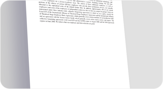 Employees We employ approximately 1,200 full and part-time employees, most of which are currently covered by employment contracts, which generally include non-disclosure agreements. Of that total, approximately three quarters are directly employed in the production of our films as animators, modelers, story artists, visual development artists, layout artists, editors, technical directors, lighters and visual effects artists and production staff, approximately 180 are primarily engaged in supporting and developing our animation technology, and approximately 80 work on general corporate and administrative matters, including training. We also hire additional employees on a picture-by-picture basis. The salaries of these additional employees, as well as portions of the salaries of certain full-time employees who provide direct production services, are typically allocated to the capitalized costs of the related feature film. In addition, approximately 450 of our current employees (and some of the employees or independent contractors that we hire on a project-by-project basis) are represented under three industry-wide collective bargaining agreements to which we are a party, namely the Local 839 of the International Alliance of Theatrical Stage Employees Agreement and the International Alliance of Theatrical Stage Employee Basic Agreement, which generally cover certain members of our production staff, and an agreement with the Screen Actors Guild, which generally covers artists such as actors and singers. The collective bargaining agreements with Local 839 and the IATSE expire in August 2006 and the SAG agreement expires in June 2008. We believe that our employee and labor relations are good. 21