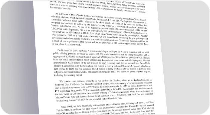 DreamWorks Studios’ seasoned theatrical marketing, distribution and home video teams. Please see “—How We Distribute, Promote and Market our Films—Distribution Agreement” for a more detailed description of the Distribution Agreement. CompanyHistory Prior to the Separation on October 27, 2004, we were a business division of DreamWorks Studios, the diversified entertainment company formed in October 1994 by Steven Spielberg, Jeffrey Katzenberg and David Geffen. We have grown from several hundred employees releasing a single animated film per year to our current status as a separate company with approximately 1,200 employees and the capacity to release two CG animated feature films annually. As a division of DreamWorks Studios, we conducted our business primarily through DreamWorks Studios’ animation division, which included DreamWorks Animation L.L.C. and PDI. The Separation was completed in connection with our initial public offering by the direct transfer of certain of the assets and liabilities that comprise our business, as well as by the transfer, by way of merger or otherwise, of certain of DreamWorks Studios’ subsidiaries to us. As part of the Separation, we acquired all of the outstanding stock of PDI and PDI LLC. Prior to the Separation, PDI was an approximately 90% owned subsidiary of DreamWorks Studios and its sole asset was its 60% interest in PDI LLC, of which DreamWorks Studios owned the remaining 40%. PDI LLC was formed in 1997 as a joint venture between PDI and DreamWorks Studios for the principal purpose of developing and enhancing the production processes used in the creation of CG animated characters and films. As a result of our acquisition of PDI, current and former employees of PDI received approximately 276,924 shares of our Class A common stock. OnOctober 28, 2004, our Class A common stock began trading on the NYSE in connection with our initial public offering pursuant to which we sold 25,000,000 newly-issued shares and the selling stockholders sold an aggregate of 8,350,000 existing shares at a price of $28.00 per share. We realized net proceeds of $635.5 million from our initial public offering, net of underwriting discounts and commissions and offering expenses. We used approximately $325 million of the net proceeds to repay revolving credit debt we assumed from DreamWorks Studios in connection with the Separation, $30 million to repay a portion of DreamWorks Studios’ subordinated debt owned to HBO that we assumed, $101.4 million to repay revolving debt we incurred to purchase films subject to the DreamWorks Studios film securitization facility and $179.1 million for general corporate purposes, including for working capital. We conduct our business primarily in two studios—in Glendale, where we are headquartered, and in Redwood City, California. Our Glendale animation campus, where the majority of our animators and production staff is based, was custom built in 1997 for use as an animation studio. In 1997, we formed a joint venture with PDI to produce Antz, and in 2000 we acquired a controlling stake in PDI. Our animators hold numerous awards for their work in CG animation, most recently winning a Technical Achievement Award from the Academy of Motion Picture Arts and Sciences for our facial animation system. Both Shrek 2 and Shark Tale were nominated ® for Academy Awards in 2004 for best animated feature film of the year. Since 1998, we have theatrically released nine animated feature films, including both Shrek 2 and Shark Tale in 2004. In addition, we have released one animated direct-to-video film. Historically, we have produced both CG animated feature films as well as hand-drawn two dimensional animated feature films. While all of our films produced to date, except Chicken Run, contained CG images, only Antz, Shrek, Shrek 2 and Shark Tale were created solely using CG animation. The average domestic box office performance of those films has been significantly higher than that of our hand-drawn, two dimensional feature films. In 2001, due to the success of CGanimated films, we decided to exit the hand-drawn, two dimensional animation business after the completion and release, in 2002 and 2003, of the two remaining hand-drawn features that were in production. Beginning with Shrek 2, all films in production and projects in development, other than certain films that we may finance, co- produce or distribute for Aardman Animations, are expected to be produced solely using CG images and 3