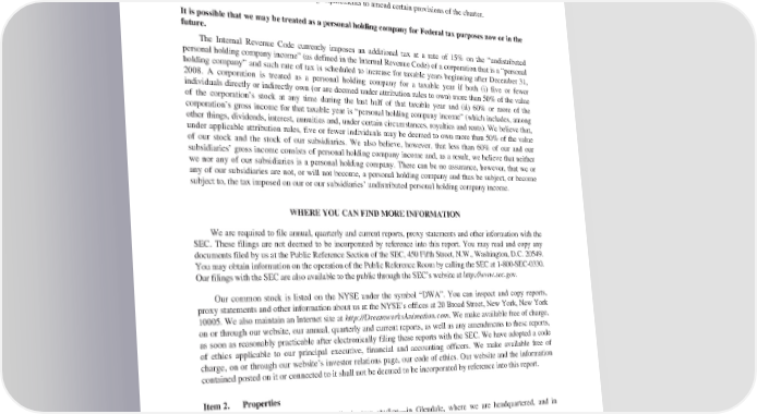 • limitations on who may call special meetings of stockholders; • advance notice requirements for stockholder proposals; • following such time as the outstanding shares of Class B common stock cease to represent a majority of the combined voting power of the voting stock, super-majority voting requirements for stockholders to amendtheby-laws; and • stockholder super-majority voting requirements to amend certain provisions of the charter. It is possible that we may be treated as a personal holding company for Federal tax purposes now or in the future. The Internal Revenue Code currently imposes an additional tax at a rate of 15% on the “undistributed personal holding company income” (as defined in the Internal Revenue Code) of a corporation that is a “personal holding company” and such rate of tax is scheduled to increase for taxable years beginning after December 31, 2008. A corporation is treated as a personal holding company for a taxable year if both (i) five or fewer individuals directly or indirectly own (or are deemed under attribution rules to own) more than 50% of the value of the corporation’s stock at any time during the last half of that taxable year and (ii) 60% or more of the corporation’s gross income for that taxable year is “personal holding company income” (which includes, among other things, dividends, interest, annuities and, under certain circumstances, royalties and rents). We believe that, under applicable attribution rules, five or fewer individuals may be deemed to own more than 50% of the value of our stock and the stock of our subsidiaries. We also believe, however, that less than 60% of our and our subsidiaries’ gross income consists of personal holding company income and, as a result, we believe that neither we nor any of our subsidiaries is a personal holding company. There can be no assurance, however, that we or any of our subsidiaries are not, or will not become, a personal holding company and thus be subject, or become subject to, the tax imposed on our or our subsidiaries’ undistributed personal holding company income. WHEREYOUCANFINDMOREINFORMATION Weare required to file annual, quarterly and current reports, proxy statements and other information with the SEC. These filings are not deemed to be incorporated by reference into this report. You may read and copy any documents filed by us at the Public Reference Section of the SEC, 450 Fifth Street, N.W., Washington, D.C. 20549. Youmayobtaininformation on the operation of the Public Reference Room by calling the SEC at 1-800-SEC-0330. Ourfilings with the SEC are also available to the public through the SEC’s website at http://www.sec.gov. Our common stock is listed on the NYSE under the symbol “DWA”. You can inspect and copy reports, proxy statements and other information about us at the NYSE’s offices at 20 Broad Street, New York, New York 10005. We also maintain an Internet site at http://DreamworksAnimation.com. We make available free of charge, on or through our website, our annual, quarterly and current reports, as well as any amendments to these reports, as soon as reasonably practicable after electronically filing these reports with the SEC. We have adopted a code of ethics applicable to our principal executive, financial and accounting officers. We make available free of charge, on or through our website’s investor relations page, our code of ethics. Our website and the information contained posted on it or connected to it shall not be deemed to be incorporated by reference into this report. Item 2. Properties We conduct our business primarily in two studios—in Glendale, where we are headquartered, and in RedwoodCity,California. Glendale Animation Campus Our Glendale animation campus is approximately 326,000 square feet and houses approximately 1,100 employees, including employees of DreamWorks Studios. In May 1996, we entered into an agreement with a 36