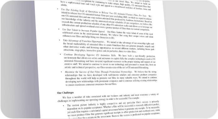 OurStrategy Weintend to maintain our position as one of the leading developers and producers of CG animated feature films. To accomplish this goal, we are pursuing the major strategies described below. • Focus on Maintaining Broad Audience Appeal for Our Films Through the Unique Identity of DreamWorks Animation. Webelieve that DreamWorks has developed a unique identity that the public associates with innovative and popular movies such as the Shrek films. We intend to build on DreamWorks’ brand recognition by continuing to make unique, high quality, CG animated films that have a sophisticated tone and visual style and appeal to a broad-based audience of families, teens and adults. • Use Our Existing Scale of Operations to Release Two CG Animated Feature Films Per Year.We intend to release two CG animated feature films per year (excluding 2005, in which we expect to release one CGanimated film and one stop-motion animated film produced by Aardman Animations). Based on our knowledge of the industry and the announced release schedules of our competitors, we believe this exceeds the current production schedule of any other CG animation studio and allows us to leverage our infrastructure and spread overhead costs over a greater number of films than our current competitors. • Use Star Talent to Increase Popular Appeal. Our films feature the voice talent of some of the most celebrated actors in the entertainment industry. We believe that using their unique voices and talent enhances our films and helps bring our characters to life. • Take Advantage of Franchise Opportunities. Weintend to take advantage of our ownership rights and the broad marketability of animated films to create franchises that can generate prequels, sequels and other derivative works and licensing opportunities in several different markets, including theme park attractions, stage plays, interactive games and, in particular, direct-to-video films. • Continue Developing Superior CG Animation Skills. We have built a user-friendly production environment that allows our artists and animators to exploit fully the complex technologies used in CG animated filmmaking and have invested significant resources in the proper training and support of our creative staff. We intend to continue to invest in our technology and personnel to ensure that, from an artistic and technical perspective, our films remain state-of-the-art in CG animated filmmaking. • Maximize the Success of Our Films Through Promotional Partnerships. We believe that the strong relationships that we have developed with well-known retailers and consumer products companies throughout the world will help us promote our films in many valuable ways. We intend to continue developing new relationships with prominent companies and to continue utilizing existing relationships to ensure maximum consumer awareness for our films. OurChallenges We face a number of risks associated with our business and industry and must overcome a variety of challenges in implementing our operating strategy in order to be successful. For example: • The motion picture industry is highly competitive and any particular film’s success is primarily dependent on its popular acceptance. Whether a film will be successful is extremely difficult to predict, yet each film requires a substantial capital investment before it generates any receipts. To be successful, we must produce films that generate significant receipts to offset production and overhead costs, while also providing for a return on the investment. Because this success is predicated on popular acceptance, it cannot be predicted with certainty. • Unlike the major U.S. studios, which release an average of approximately 29 movies per year, we expect to release two CG animated films per year for the foreseeable future (excluding 2005, in which we expect to release one CG animated film and one stop-motion animated film produced by Aardman Animations). The commercial failure of any one of them could have a material adverse effect on our business. 5