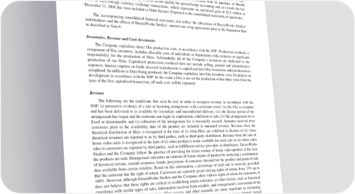 DREAMWORKSANIMATIONSKG,INC. NOTESTOCONSOLIDATEDFINANCIALSTATEMENTS—(Continued) DreamWorks Animation has entered into loan agreements with two banks for financing of the production of a film (see Note 6). In connection with these agreements, the Company entered into foreign currency exchange transactions to limit the Company’s foreign exchange rate exposure associated with its purchase of British pounds to finance the film. These agreements do not qualify for special hedge accounting and, as a result, the fair value of such foreign currency exchange transactions, which represents an unrealized gain of $2.6 million at December31,2004,hasbeenincluded in Other Income (Expense) in the consolidated statements of operations. The accompanying consolidated financial statements also reflect the allocations of DreamWorks Studios’ indebtedness and the effects of DreamWorks Studios’ interest rate swap agreements prior to the Separation Date as described in Note 6. Inventories, Revenue and Costs Inventories The Company capitalizes direct film production costs in accordance with the SOP. Production overhead, a component of film inventory, includes allocable costs of individuals or departments with exclusive or significant responsibility for the production of films. Substantially all of the Company’s resources are dedicated to the production of our films. Capitalized production overhead does not include selling, general and administrative expenses. Interest expense on funds invested in production is capitalized into film inventories until production is completed. In addition to films being produced, the Company capitalizes into film inventory costs for projects in development in accordance with the SOP. In the event a film is not set for production within three years from the time of the first capitalized transaction, all such costs will be expensed. Revenue The following are the conditions that must be met in order to recognize revenue in accordance with the SOP: (i) persuasive evidence of a sale or licensing arrangement with a customer exists; (ii) the film is complete and has been delivered or is available for immediate and unconditional delivery; (iii) the license period of the arrangement has begun and the customer can begin its exploitation, exhibition or sale; (iv) the arrangement fee is fixed or determinable and (v) collection of the arrangement fee is reasonably assured. Amounts received from customers prior to the availability date of the product are included in unearned revenue. Revenue from the theatrical distribution of films is recognized at the later of (i) when films are exhibited in theatres or (ii) when theatrical revenues are reported to us by third parties, such as third party distributors. Revenue from the sale of home video units is recognized at the later of (i) when product is made available for retail sale or (ii) when video sales to customers are reported by third parties, such as fulfillment service providers or distributors. DreamWorks Studios and the Company follow the practice of providing for future returns of home video product at the time the products are sold. Management calculates an estimate of future returns of product by analyzing a combination of historical returns, current economic trends, projections of consumer demand for the product and point-of-sale data available from certain retailers. Based on this information, a percentage of each sale is reserved, provided that the customer has the right of return. Customers are currently given varying rights of return, from 15% up to 100%. However, although DreamWorks Studios and the Company allow various rights of return for customers, it does not believe that these rights are critical in establishing return estimates, as other factors, such as historical experience with similar types of sales, information received from retailers, and management’s assessment of the products appeal based on domestic box office success and other research, are more important in estimating. Generally, payment terms are within 90 days from the end of the month in which the product was shipped. Actual returns are charged against the reserve. Revenue associated with the licensing of home video product under revenue-sharing agreements is recorded as earned under the terms of the underlying agreements. Revenue from both free and pay television licensing agreements are recognized at the time the production is madeavailable for exhibition in those markets. 75