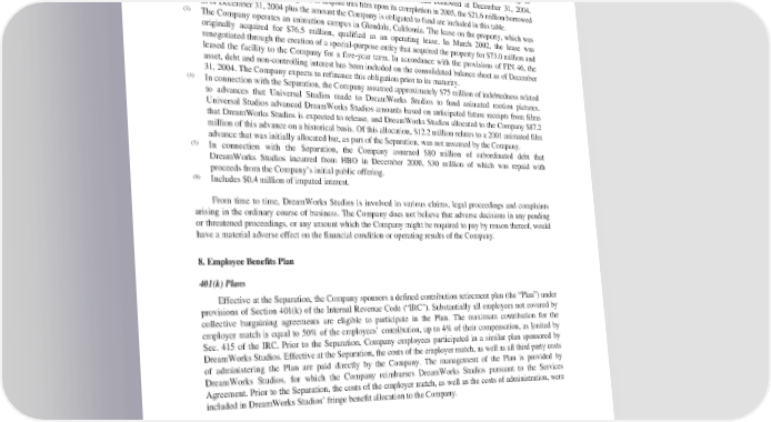 DREAMWORKSANIMATIONSKG,INC. NOTESTOCONSOLIDATEDFINANCIALSTATEMENTS—(Continued) the film (of which $34.9 million had been paid as of December 31, 2004). In connection with the acquisition, DreamWorks Studios entered into loan agreements for the financing of the production costs of up to approximately $27.8 million. Of this amount, $21.6 million had been borrowed at December 31, 2004. Because the Company is obligated to acquire this film upon its completion in 2005, the $21.6 million borrowed as of December 31, 2004 plus the amount the Company is obligated to fund are included in this table. (3) The Company operates an animation campus in Glendale, California. The lease on the property, which was originally acquired for $76.5 million, qualified as an operating lease. In March 2002, the lease was renegotiated through the creation of a special-purpose entity that acquired the property for $73.0 million and leased the facility to the Company for a five-year term. In accordance with the provisions of FIN 46, the asset, debt and non-controlling interest has been included on the consolidated balance sheet as of December 31, 2004. The Company expects to refinance this obligation prior to its maturity. (4) In connection with the Separation, the Company assumed approximately $75 million of indebtedness related to advances that Universal Studios made to DreamWorks Studios to fund animated motion pictures. Universal Studios advanced DreamWorks Studios amounts based on anticipated future receipts from films that DreamWorks Studios is expected to release, and DreamWorks Studios allocated to the Company $87.2 million of this advance on a historical basis. Of this allocation, $12.2 million relates to a 2001 animated film advance that was initially allocated but, as part of the Separation, was not assumed by the Company. (5) In connection with the Separation, the Company assumed $80 million of subordinated debt that DreamWorks Studios incurred from HBO in December 2000, $30 million of which was repaid with proceeds from the Company’s initial public offering. (6) Includes $0.4 million of imputed interest. From time to time, DreamWorks Studios is involved in various claims, legal proceedings and complaints arising in the ordinary course of business. The Company does not believe that adverse decisions in any pending or threatened proceedings, or any amount which the Company might be required to pay by reason thereof, would have a material adverse effect on the financial condition or operating results of the Company. 8. Employee Benefits Plan 401(k) Plans Effective at the Separation, the Company sponsors a defined contribution retirement plan (the “Plan”) under provisions of Section 401(k) of the Internal Revenue Code (“IRC”). Substantially all employees not covered by collective bargaining agreements are eligible to participate in the Plan. The maximum contribution for the employer match is equal to 50% of the employees’ contribution, up to 4% of their compensation, as limited by Sec. 415 of the IRC. Prior to the Separation, Company employees participated in a similar plan sponsored by DreamWorksStudios. Effective at the Separation, the costs of the employer match, as well as all third party costs of administering the Plan are paid directly by the Company. The management of the Plan is provided by DreamWorks Studios, for which the Company reimburses DreamWorks Studios pursuant to the Services Agreement. Prior to the Separation, the costs of the employer match, as well as the costs of administration, were included in DreamWorks Studios’ fringe benefit allocation to the Company. Employee Equity Plans Prior to the Separation, the Company participated in DreamWorks Studios’ Employee Equity Participation Plan (the “Equity Plan”). DreamWorks Studios granted to employees or consultants either actual or phantom shares of stock (“Shares”). For the year ended December 31, 2002, compensation expense attributable to the Company’s employees pursuant to the Equity Plan of $0.3 million was allocated to the Company. During the year ended December 31, 2003 and 2004, DreamWorks Studios determined that the fair market value of the 88