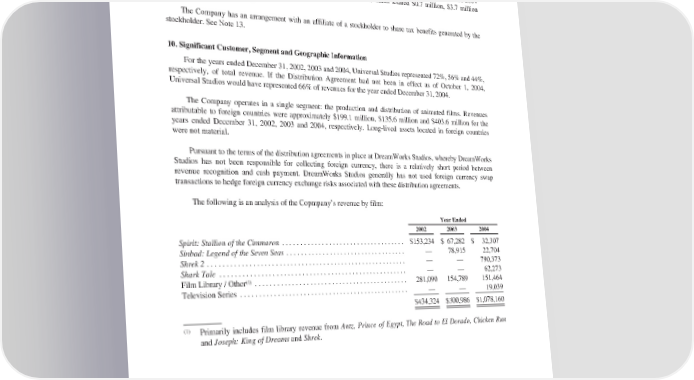 DREAMWORKSANIMATIONSKG,INC. NOTESTOCONSOLIDATEDFINANCIALSTATEMENTS—(Continued) The Company provides services to DreamWorks Studios related to the licensing of products based on DreamWorks Studios’ films and characters in such films. In the years ended December 31, 2002, 2003 and 2004 revenues earned from licensing activities on behalf of DreamWorks Studios totaled $0.7 million, $3.7 million and $3.7 million, respectively. The Company has an arrangement with an affiliate of a stockholder to share tax benefits generated by the stockholder. See Note 13. 10. Significant Customer, Segment and Geographic Information For the years ended December 31, 2002, 2003 and 2004, Universal Studios represented 72%, 56% and 44%, respectively, of total revenue. If the Distribution Agreement had not been in effect as of October 1, 2004, Universal Studios would have represented 66% of revenues for the year ended December 31, 2004. The Company operates in a single segment: the production and distribution of animated films. Revenues attributable to foreign countries were approximately $199.1 million, $135.6 million and $403.6 million for the years ended December 31, 2002, 2003 and 2004, respectively. Long-lived assets located in foreign countries were not material. Pursuant to the terms of the distribution agreements in place at DreamWorks Studios, whereby DreamWorks Studios has not been responsible for collecting foreign currency, there is a relatively short period between revenue recognition and cash payment. DreamWorks Studios generally has not used foreign currency swap transactions to hedge foreign currency exchange risks associated with these distribution agreements. Thefollowing is an analysis of the Copmpany’s revenue by film: YearEnded 2002 2003 2004 Spirit: Stallion of the Cimmaron ................................... $153,234 $ 67,282 $ 32,307 Sinbad: Legend of the Seven Seas .................................. — 78,915 22,704 Shrek 2 ....................................................... — — 790,373 Shark Tale .................................................... — — 62,273 Film Library / Other(1) ........................................... 281,090 154,789 151,464 Television Series ............................................... — — 19,039 $434,324 $300,986 $1,078,160 (1) Primarily includes film library revenue from Antz, Prince of Egypt, The Road to El Dorado, Chicken Run and Joseph: King of Dreams and Shrek. 91