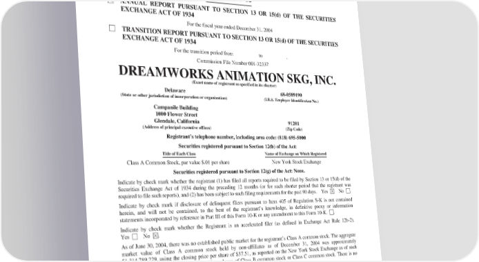 UNITEDSTATES SECURITIESANDEXCHANGECOMMISSION Washington,D.C.20549 FORM10-K È ANNUAL REPORT PURSUANT TO SECTION 13 OR 15(d) OF THE SECURITIES EXCHANGEACTOF1934 For the fiscal year ended December 31, 2004 ‘ TRANSITIONREPORTPURSUANTTOSECTION13OR15(d)OFTHESECURITIES EXCHANGEACTOF1934 For the transition period from to . Commission File Number 001-32337 DREAMWORKSANIMATIONSKG,INC. (Exact name of registrant as specified in its charter) Delaware 68-0589190 (State or other jurisdiction of incorporation or organization) (I.R.S. Employer Identification No.) CampanileBuilding 1000 Flower Street Glendale, California 91201 (Address of principal executive offices) (Zip Code) Registrant’s telephone number, including area code: (818) 695-5000 Securities registered pursuant to Section 12(b) of the Act: Title of Each Class NameofExchangeonWhichRegistered Class A CommonStock, par value $.01 per share NewYorkStockExchange Securities registered pursuant to Section 12(g) of the Act: None. Indicate by check mark whether the registrant (1) has filed all reports required to be filed by Section 13 or 15(d) of the Securities Exchange Act of 1934 during the preceding 12 months (or for such shorter period that the registrant was required to file such reports), and (2) has been subject to such filing requirements for the past 90 days. Yes È No ‘. Indicate by check mark if disclosure of delinquent filers pursuant to Item 405 of Regulation S-K is not contained herein, and will not be contained, to the best of the registrant’s knowledge, in definitive proxy or information statements incorporated by reference in Part III of this Form 10-K or any amendment to this Form 10-K. ‘. Indicate by check mark whether the Registrant is an accelerated filer (as defined in Exchange Act Rule 12b-2). Yes ‘ No È. As of June 30, 2004, there was no established public market for the registrant’s Class A common stock. The aggregate market value of Class A common stock held by non-affiliates as of December 31, 2004 was approximately $1,314,789,229, using the closing price per share of $37.51, as reported on the New York Stock Exchange as of such date. As of such date, non-affiliates held no shares of Class B common stock or Class C common stock. There is no active market for the Class B common stock or the Class C common stock. As of March 1, 2005, there were 52,174,447 shares of Class A common stock, 50,842,414 shares of Class B common stock and one share of Class C common stock outstanding. DOCUMENTSINCORPORATEDBYREFERENCE Certain information required by Part III of this report is incorporated by reference from the registrant’s proxy statement to be filed pursuant to Regulation 14A with respect to the registrant’s 2005 annual meeting of stockholders.