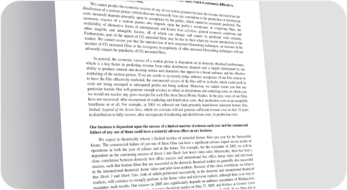 RISKFACTORS You should carefully consider the following risks and other information in this report before making an investment decision with respect to shares of our Class A common stock. The following risks and uncertainties could materially adversely affect our business, financial condition or operating results. Oursuccess is primarily dependent on audience acceptance of our films, which is extremely difficult to predict and therefore inherently risky. Wecannotpredict the economic success of any of our motion pictures because the revenue derived from the distribution of a motion picture (which does not necessarily bear any correlation to the production or distribution costs incurred) depends primarily upon its acceptance by the public, which cannot be accurately predicted. The economic success of a motion picture also depends upon the public’s acceptance of competing films, the availability of alternative forms of entertainment and leisure time activities, general economic conditions and other tangible and intangible factors, all of which can change and cannot be predicted with certainty. Furthermore, part of the appeal of CG animated films may be due to their relatively recent introduction to the market. We cannot assure you that the introduction of new animated filmmaking techniques, an increase in the number of CG animated films or the resurgence in popularity of older animated filmmaking techniques will not adversely impact the popularity of CG animated films. In general, the economic success of a motion picture is dependent on its domestic theatrical performance, which is a key factor in predicting revenue from other distribution channels and is largely determined by our ability to produce content and develop stories and characters that appeal to a broad audience and the effective marketing of the motion picture. If we are unable to accurately judge audience acceptance of our film content or to have the film effectively marketed, the commercial success of the film will be in doubt, which could result in costs not being recouped or anticipated profits not being realized. Moreover, we cannot assure you that any particular feature film will generate enough revenue to offset its distribution and marketing costs, in which case we would not receive any gross receipts for such film from DreamWorks Studios. In the past, some of our films have not recovered, after recoupment of marketing and distribution costs, their production costs in an acceptable timeframe or at all. For example, in 2003 we released our final primarily hand-drawn animated feature film, Sinbad: Legend of the Seven Seas, which we estimate will not generate sufficient revenue over its first 10 years in distribution to fully recover, after recoupment of marketing and distribution costs, its production costs. Ourbusinessis dependent upon the success of a limited number of releases each year and the commercial failure of any one of them could have a material adverse effect on our business. We expect to theatrically release a limited number of animated feature films per year for the foreseeable future. The commercial failure of just one of these films can have a significant adverse impact on our results of operations in both the year of release and in the future. For example, for the remainder of 2005, we will be dependent on the continuing success of Shrek 2 and Shark Tale home video sales. Historically, there has been a close correlation between domestic box office success and international box office, home video and television success, such that feature films that are successful in the domestic theatrical market are generally also successful in the international theatrical, home video and television markets. Because of this close correlation, we believe that Shrek 2 and Shark Tale, both of which performed successfully in the domestic and international theatrical markets, will continue to strongly perform in the home video and television markets, although there is no way to guarantee such results. Our success in 2005 also significantly depends on audience acceptance of Madagascar, which is scheduled for release in the domestic theatrical market on May 27, 2005, and Wallace & Gromit: Curse of the Were Rabbit, which is scheduled for domestic theatrical release on October 7, 2005. If our films fail to achieve domestic box office success, because of the close correlation mentioned above, their international box office and home video success and our business, results of operations and financial condition could be adversely affected in the remainder of 2005 and beyond. Further, we can make no assurances that the historical correlation between domestic box office results and international box office and home video results will continue in the future. In addition, we can make no assurances that home video wholesale prices can be maintained at current 22