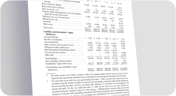 Consolidated Balance Sheet Data December31, 2000 2001 2002 2003 2004 (Unaudited) (Audited) (In thousands) Assets Cash and cash equivalents .................... $ 164 $ 835 $ 3 $ 41 $ 63,134 Accounts receivable, net of allowance for doubtful accounts ................................ 147,082 313,966 150,915 132,329 14,015 Receivable from affiliate ..................... — — — — 372,116 Receivables from employees .................. 2,544 1,360 2,080 2,480 1,634 Film inventories, net ........................ 516,019 444,207 477,613 427,463 519,926 Property, plant and equipment, net of accumulated depreciation and amortization ............... 11,505 13,250 20,632 89,777 85,997 Deferred costs, net of amortization ............. — — 1,986 1,641 3,741 Deferred taxes, net .......................... — — — — 93,343 Goodwill ................................. 25,998 26,462 26,462 26,462 34,216 Other assets ............................... 299 298 578 1,644 11,881 Total assets ................................ $703,611 $800,378 $680,269 $681,837 $1,200,003 Liabilities and Stockholders’ Equity (Deficiency) Accounts payable ........................... $ 5,323 $ 13,382 $ 1,994 $ 1,615 $ 4,414 Payable to stockholder ....................... — — — — 70,643 Accrued liabilities .......................... 76,009 122,235 117,902 101,993 58,968 Other advances and unearned revenue .......... 27,568 11,090 32,902 38,684 18,892 Obligations under capital leases ............... 5,595 5,001 4,375 3,732 2,993 Debt allocated by DreamWorks Studios ......... 105,999 168,461 313,814 418,379 — Universal Studios advance .................... — — 32,295 50,325 75,000 Other debt ................................ — — — 76,612 139,207 Total liabilities ............................. 220,494 320,169 503,282 691,340 370,117 Non-controlling minority interest .............. — — — 2,941 2,941 Stockholders’ equity (deficiency) .............. 483,117 480,209 176,987 (12,444) 826,945 Total liabilities and stockholders’ equity (deficiency) ............................. $703,611 $800,378 $680,269 $681,837 $1,200,003 (1) Pro forma income (loss) before cumulative effect of accounting changes and pro forma net income (loss) represents the amounts that would have been recorded had we been incorporated and paid taxes historically. (2) For each of the years in the four year period ending December 31, 2003, pro forma basic share amounts are calculated using the number of shares of common stock outstanding immediately following the Separation, but not including the shares issued in our initial public offering, as if such shares were outstanding for all periods presented. For the year ended December 31, 2004, the pro forma basic per share amounts are calculated using the weighed average of: (i) from January 1, 2004 through the Separation Date, the number of shares of common stock outstanding immediately following the Separation, but not including the shares issued in our initial public offering, as if such shares were outstanding for the entire period and (ii) from the Separation Date through December 31, 2004, the weighted average number of shares of common stock outstanding. (3) Pro forma diluted per share amounts for each of the years in the four year period ending December 31, 2003 are calculated using the number of shares of common stock outstanding immediately following the Separation, but not including the shares issued in our initial public offering, as if such shares were outstanding for all periods presented, excluding, because their effect would be anti-dilutive, the impact of 487,000 shares 42