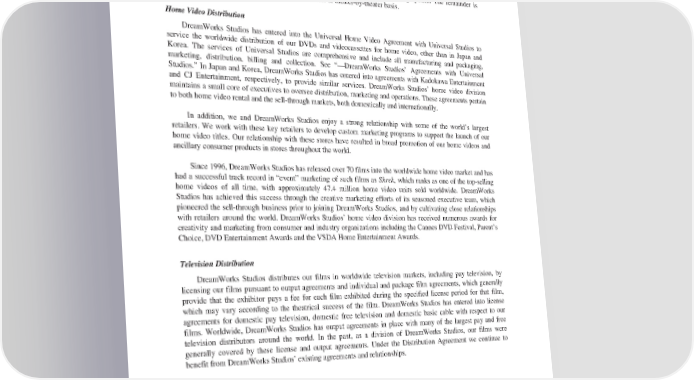 DreamWorks Studios is directly responsible for all billing and collection of gross rentals from theater operators for the domestic markets. Each week, DreamWorks Studios receives a billing statement from each theater indicating the level of box office receipts. The billing is followed by a written confirmation of receipts, at which time DreamWorks Studios prepares a bill to the theater owner. DreamWorks Studios estimates that at least 80% of the box office data required to generate theater billings is received through a centralized collection information agency that is linked directly to DreamWorks Studios’ book-to-billing system. The remainder is generated through direct inquiry on a circuit-by-circuit or theater-by-theater basis. HomeVideoDistribution DreamWorks Studios has entered into the Universal Home Video Agreement with Universal Studios to service the worldwide distribution of our DVDs and videocassettes for home video, other than in Japan and Korea. The services of Universal Studios are comprehensive and include all manufacturing and packaging, marketing, distribution, billing and collection. See “—DreamWorks Studios’ Agreements with Universal Studios.” In Japan and Korea, DreamWorks Studios has entered into agreements with Kadokawa Entertainment and CJ Entertainment, respectively, to provide similar services. DreamWorks Studios’ home video division maintains a small core of executives to oversee distribution, marketing and operations. These agreements pertain to both home video rental and the sell-through markets, both domestically and internationally. In addition, we and DreamWorks Studios enjoy a strong relationship with some of the world’s largest retailers. We work with these key retailers to develop custom marketing programs to support the launch of our home video titles. Our relationship with these stores have resulted in broad promotion of our home videos and ancillary consumer products in stores throughout the world. Since 1996, DreamWorks Studios has released over 70 films into the worldwide home video market and has had a successful track record in “event” marketing of such films as Shrek, which ranks as one of the top-selling home videos of all time, with approximately 47.4 million home video units sold worldwide. DreamWorks Studios has achieved this success through the creative marketing efforts of its seasoned executive team, which pioneered the sell-through business prior to joining DreamWorks Studios, and by cultivating close relationships with retailers around the world. DreamWorks Studios’ home video division has received numerous awards for creativity and marketing from consumer and industry organizations including the Cannes DVD Festival, Parent’s Choice, DVDEntertainment Awards and the VSDA Home Entertainment Awards. Television Distribution DreamWorks Studios distributes our films in worldwide television markets, including pay television, by licensing our films pursuant to output agreements and individual and package film agreements, which generally provide that the exhibitor pays a fee for each film exhibited during the specified license period for that film, which may vary according to the theatrical success of the film. DreamWorks Studios has entered into license agreements for domestic pay television, domestic free television and domestic basic cable with respect to our films. Worldwide, DreamWorks Studios has output agreements in place with many of the largest pay and free television distributors around the world. In the past, as a division of DreamWorks Studios, our films were generally covered by these license and output agreements. Under the Distribution Agreement we continue to benefit from DreamWorks Studios’ existing agreements and relationships. ConsumerProducts We have directly entered into strategic licensing arrangements with a number of well-known consumer products companies that generate royalty-based licensing fees. In general, pursuant to these agreements we provide a license to use our characters and film elements in connection with merchandise in exchange for a percentage of net sales of those products. We have entered into agreements with companies such as Activision, Hasbro, Scholastic and Hallmark. Activision is our interactive partner for a number of our movies, including 15