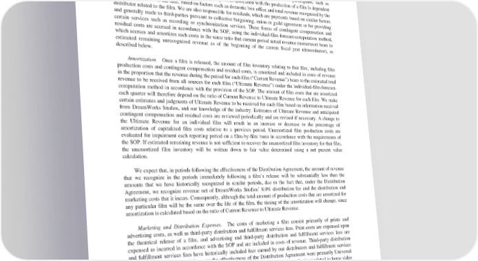 development and production on a quarterly basis to determine whether capitalized costs are in excess of our estimate of fair value. If they are in excess, then we write-off the excess cost and reflect these in costs of revenue. In addition, after three years, if the project is still in development and has not been set for production, it is written off and reflected in costs of revenue. Contingent Compensation and Residuals. Certain compensation paid to creative participants, such as writers, producers, directors, voice talent and other persons associated with the production of a film is dependent on the performance of the film, based on factors such as domestic box office and total revenue recognized by the distributor related to the film. We are also responsible for residuals, which are payments based on similar factors and generally made to third-parties pursuant to collective bargaining, union or guild agreement or for providing certain services such as recording or synchronization services. These forms of contingent compensation and residual costs are accrued in accordance with the SOP, using the individual-film-forecast-computation method, which accrues and amortizes such costs in the same ratio that current period actual revenue (numerator) bears to estimated remaining unrecognized revenue as of the beginning of the current fiscal year (denominator), as described below. Amortization. Once a film is released, the amount of film inventory relating to that film, including film production costs and contingent compensation and residual costs, is amortized and included in costs of revenue in the proportion that the revenue during the period for each film (“Current Revenue”) bears to the estimated total revenue to be received from all sources for each film (“Ultimate Revenue”) under the individual-film-forecast- computation method in accordance with the provision of the SOP. The amount of film costs that are amortized each quarter will therefore depend on the ratio of Current Revenue to Ultimate Revenue for each film. We make certain estimates and judgments of Ultimate Revenue to be received for each film based on information received from DreamWorks Studios, and our knowledge of the industry. Estimates of Ultimate Revenue and anticipated contingent compensation and residual costs are reviewed periodically and are revised if necessary. A change to the Ultimate Revenue for an individual film will result in an increase or decrease to the percentage of amortization of capitalized film costs relative to a previous period. Unamortized film production costs are evaluated for impairment each reporting period on a film-by-film basis in accordance with the requirements of the SOP. If estimated remaining revenue is not sufficient to recover the unamortized film inventory for that film, the unamortized film inventory will be written down to fair value determined using a net present value calculation. Weexpect that, in periods following the effectiveness of the Distribution Agreement, the amount of revenue that we recognize in the periods immediately following a film’s release will be substantially less than the amounts that we have historically recognized in similar periods, due to the fact that, under the Distribution Agreement, we recognize revenue net of DreamWorks Studios’ 8.0% distribution fee and the distribution and marketing costs that it incurs. Consequently, although the total amount of production costs that are amortized for any particular film will be the same over the life of the film, the timing of the amortization will change, since amortization is calculated based on the ratio of Current Revenue to Ultimate Revenue. Marketing and Distribution Expenses. The costs of marketing a film consist primarily of prints and advertising costs, as well as third-party distribution and fulfillment services fees. Print costs are expensed upon the theatrical release of a film, and advertising and third-party distribution and fulfillment services fees are expensed as incurred in accordance with the SOP and are included in costs of revenue. Third-party distribution and fulfillment services fees have historically included fees earned by our distributors and fulfillment services providers, which in the periods up to the effectiveness of the Distribution Agreement were primarily Universal Studios and CJ Entertainment. Manufacturing costs (including duplication and replication) related to home video units are expensed when the related product revenue is recognized. We periodically evaluate inventories of such products for impairment and obsolescence and make appropriate adjustments to their carrying value as necessary. Although our historical financial statements include these costs, as described above, pursuant to the Distribution Agreement, DreamWorks Studios is generally responsible for all costs associated with the distribution and marketing of our films. Accordingly, in the future, our costs of revenue will be lower than historical because they 54