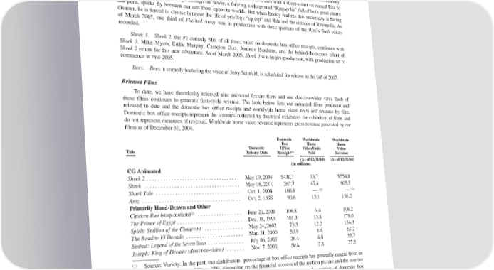 treasure trove to be had from his unsuspecting new neighbors. Together, Verne and R.J. form an unlikely friendship as they observe and exploit this strange new world called suburbia. As March 2005, one third of Over the Hedge was in production, with three quarters of the film’s final voices recorded. Flushed Away. Flushed Away marks the third collaboration between us and Aardman Animations. Sophisticated socialite rat, Roderick St. James, lives a charmed life in a posh Kensington flat. Accidentally flushed down his own loo, Roddy winds up in the sewer and strikes a deal with a street-smart rat named Rita to take him home. As they voyage through the sewer, a thriving underground “Ratropolis” full of both great charm and peril, sparks fly between our rats from opposite worlds. But when Roddy realizes this secret city is facing disaster, he is forced to choose between the life of privilege “up top” and Rita and the citizens of Ratropolis. As of March 2005, one third of Flushed Away was in production with three quarters of the film’s final voices recorded. Shrek 3. Shrek 2, the #1 comedy film of all time, based on domestic box office receipts, continues with Shrek 3. Mike Myers, Eddie Murphy, Cameron Diaz, Antonio Banderas, and the behind-the-scenes talent of Shrek 2 return for this new adventure. As of March 2005, Shrek 3 was in pre-production, with production set to commenceinmid-2005. Bees. Bees, a comedy featuring the voice of Jerry Seinfeld, is scheduled for release in the fall of 2007. Released Films To date, we have theatrically released nine animated feature films and one direct-to-video film. Each of these films continues to generate first-cycle revenue. The table below lists our animated films produced and released to date and the domestic box office receipts and worldwide home video units and revenue by film. Domestic box office receipts represent the amounts collected by theatrical exhibitors for exhibition of films and do not represent measures of revenue. Worldwide home video revenue represents gross revenue generated by our films as of December 31, 2004. Domestic Worldwide Worldwide Box Home Home Domestic Office VideoUnits Video (1) Title Release Date Receipts Sold Revenue (As of 12/31/04) (As of 12/31/04) (In millions) CGAnimated Shrek 2 ................................... May19,2004 $436.7 33.7 $554.8 Shrek .................................... May18,2001 267.7 47.4 605.5 Shark Tale ................................ Oct. 1, 2004 160.8 — (2) — (2) Antz ..................................... Oct. 2, 1998 90.6 15.1 156.2 Primarily Hand-DrawnandOther Chicken Run (stop-motion)(3) ................. June 21, 2000 106.8 9.4 108.2 ThePrince of Egypt ......................... Dec. 18, 1998 101.3 13.8 178.0 Spirit: Stallion of the Cimarron ............... May24,2002 73.3 12.2 154.9 TheRoadtoElDorado ...................... Mar. 31, 2000 50.9 6.6 67.2 Sinbad: Legend of the Seven Seas .............. July 06, 2003 26.4 4.8 55.7 Joseph: King of Dreams (direct-to-video) ....... Nov. 7, 2000 N/A 2.8 27.2 (1) Source: Variety. In the past, our distributors’ percentage of box office receipts has generally ranged from an effective rate of over 50% to 35% depending on the financial success of the motion picture and the number of weeks that it plays at the box office. Under the Distribution Agreement, the portion of domestic box office receipts that we recognize as revenue for a film is reduced by the distribution and marketing costs and 8%distribution fee with respect to that film that DreamWorks Studios recoups. (2) Shark Tale’s home video unit sales are not included in this table, as it was released in the home video market on February 8, 2005. (3) Produced by Aardman Animations and co-financed and distributed by us in certain territories. 7