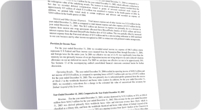 of Shrek 2 and Shark Tale, which was a combined expense of $13.0 million and an increase in personnel and professional services fees in our legal, finance, investor relations and information technology functions in order to accommodate the increased demands of a public company. Stock Compensation Expense Stock compensation expenses were $21.4 million for the year ended December 31, 2004 as compared to a stock compensation credit of $2.3 million for the year ended December 31, 2003, which reflected a reduction in the redemption value of the underlying awards. The increase in stock compensation expense resulted from the fact that we recorded deferred compensation related to grants of unvested restricted stock awards of approximately $33 million of which $1.0 million was amortized to expense in the fourth quarter of 2004. In addition, we granted fully vested stock to certain employees and advisors and recorded an expense of $20.0 million in the fourth quarter of 2004. Interest and Other Income (Expense). Total interest expense net of other income was $15.0 million for the year ended December 31, 2004 as compared to total interest expense and other expense of $15.5 million for the year ended December 31, 2003. This $0.5 million net decrease in expense was primarily due to a decrease in expense from interest rate swap agreements allocated from DreamWorks Studios of $10.0 million and lower interest expense from allocated DreamWorks Studios debt of $2.6 million. This was partially offset by increased interest expense from the Universal advance of $5.5 million and by a non-recurring settlement in 2003 unrelated to our core business and by other income recognized in 2003 in connection with preferred vendor arrangements. Provision for Income Taxes For the year ended December 31, 2004 we recorded actual income tax expense of $90.3 million which represents U.S Federal and State income taxes incurred from the Separation Date through December 31, 2004, and foreign taxes for the entire year. In 2004 our effective tax rate of 21.3% was significantly lower than the statutory tax rate primarily because of our pre-Separation income not being subject to tax and a reduced valuation allowance on our net deferred tax assets. For 2005 we anticipate our effective tax rate to be approximately 38%. See footnote 13 of the accompanying audited consolidated financial statements contained herein for further discussion. Operating Results. The year ended December 31, 2004 resulted in operating income of $438.3 million and net income of $333.0 million, as compared to operating losses of $167.3 million and a net loss of $187.2 million for the year ended December 31, 2003. This was primarily due to substantial profits generated from the success of Shrek 2 in the worldwide theatrical and home video markets In addition, for the year ended December 31, 2003, we recorded a write-down for a change in the estimated fair value of unamortized film inventory for Sinbad: Legend of the Seven Seas. Year Ended December 31, 2003, Compared to the Year Ended December 31, 2002 Revenue. For the year ended December 31, 2003, revenue decreased by $133.3 million, or 31%, to $301.0 million from $434.3 million for the year ended December 31, 2002. Film revenue for the year ended December 31, 2003 was derived primarily from worldwide home video and television revenue from Shrek, which is classified as a library title, and from the worldwide theatrical and home video release of Sinbad: Legend of the Seven Seas. Also contributing to revenue in 2003 was ongoing revenue from Spirit: Stallion of the Cimarron in the international theatrical and worldwide home video markets. Other revenue, primarily from library titles other than Shrek (Antz, Prince of Egypt, The Road to El Dorado, Chicken Run and Joseph: King of Dreams), contributed approximately $58.7 million in the year ended December 31, 2003, primarily from the worldwide homevideo and television markets. Film revenue for the year ended December 31, 2002 was primarily driven by the ongoing success of Shrek in the worldwide home video and television markets, and by the release of Spirit: Stallion of the Cimarron in the worldwide theatrical and home video markets, along with their associated 58