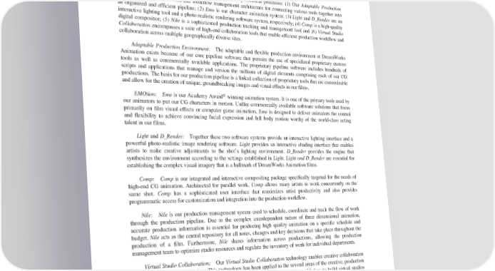 imagery in our films. Our focus on user interface and tool development enables our animators to adeptly use existing and emerging CG technologies, allowing us to leverage our extraordinary artistic talent. In addition, we have strategic relationships with leading technology companies that allow us to leverage third-party advancements and technology innovation substantially before they are available to the open market, which in the rapidly changing landscape of technology gives us a valuable advantage. We have several core proprietary technologies and production processes: (1) Our Adaptable Production Environment is a robust data and workflow management architecture for connecting various tools together into an organized and efficient pipeline; (2) Emo is our character animation system; (3) Light and D_Render are an interactive lighting tool and a photo realistic rendering software system, respectively; (4) Comp is a high-quality digital compositor; (5) Nile is a sophisticated production tracking and management tool and (6) Virtual Studio Collaboration encompasses a suite of high-end collaboration tools that enable efficient production workflow and collaboration across multiple geographically diverse sites. Adaptable Production Environment: The adaptable and flexible production environment at DreamWorks Animation exists because of our core pipeline software that permits the use of specialized proprietary custom tools as well as commercially available applications. The proprietary pipeline software includes hundreds of scripts and applications that manage and version the millions of digital elements comprising each of our CG productions. The basis for our production pipeline is a linked collection of proprietary tools that are customizable and allow for the creation of unique, groundbreaking images and visual effects in our films. ® EMOtion: Emois our Academy Award winning animation system. It is one of the primary tools used by our animators to put our CG characters in motion. Unlike commercially available software solutions that focus primarily on film visual effects or computer game animation, Emo is designed to deliver animators the control and flexibility to achieve convincing facial expression and full body motion worthy of the world-class acting talent in our films. Light and D_Render: Together these two software systems provide an interactive lighting interface and a powerful photo-realistic image rendering software. Light provides an interactive shading interface that enables artists to make creative adjustments to the shot’s lighting environment. D_Render provides the engine that synthesizes the environment according to the settings established in Light. Light and D_Render are essential for establishing the complex visual imagery that is a hallmark of DreamWorks Animation films. Comp: Comp is our integrated and interactive compositing package specifically targeted for the needs of high-end CG animation. Architected for parallel work, Comp allows many artists to work concurrently on the same shot. Comp has a sophisticated user interface that maximizes artist productivity and also provides programmatic access for customization and integration into the production workflow. Nile: Nile is our production management system used to schedule, coordinate and track the flow of work through the production pipeline. Due to the complex interdependent nature of three dimensional animation, accurate production information is essential for producing high quality animation on a specific schedule and budget. Nile acts as the central repository for all notes, changes and key decisions that take place throughout the production of a film. Furthermore, Nile shares information across productions, allowing the production management team to optimize studio resources and regulate the inventory of work for individual departments. Virtual Studio Collaboration: Our Virtual Studio Collaboration technology enables creative collaboration across multiple geographic sites. This technology has been applied to the several areas of the creative, production and technical collaboration processes at DreamWorks Animation, which has enabled us to build virtual studios across physical boundaries and leverage our talent pool without regard to location. The technology has been deployed internally to enable remote digital dailies, remote editing collaboration, remote storyboard pitching and many other forms of remote collaboration involving the real-time sharing of high- resolution images combined with interactive communication among staff. This technology, which is now at the core of our operation, has enabled us to leverage the latest in research and development with our strategic technology partners. 19