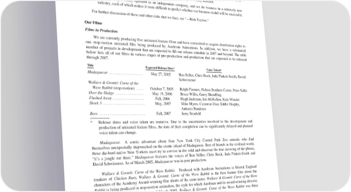 • Unlike the major studios, we are not part of large diversified corporate groups whose other operations can make up for volatility in their results. We principally operate in one business, the production of CG animated feature films, and our lack of a diversified business could adversely affect us. • Weare dependent on DreamWorks Studios for the distribution and promotion of our feature films and direct-to-video films. If DreamWorks Studios were to experience financial difficulty, file for bankruptcy or otherwise cease operations, our business could be materially adversely affected. • We have only recently operated as an independent company, and we do business in a relatively new industry, each of which makes it more difficult to predict whether our business model will be successful. For further discussion of these and other risks that we face, see “—Risk Factors.” OurFilms Films in Production Wearecurrently producing five animated feature films and have committed to acquire distribution rights to one stop-motion animated film being produced by Aardman Animations. In addition, we have a substantial number of projects in development that are expected to fill our release schedule in 2007 and beyond. The table below lists all of our films in various stages of pre-production and production that are expected to be released through 2007. Title Expected Release Date* Voice Talent* Madagascar .................. May27,2005 BenStiller, Chris Rock, Jada Pinkett-Smith, David Schwimmer Wallace & Gromit: Curse of the WereRabbit (stop-motion) .... October 7, 2005 Ralph Fiennes, Helena Bonham Carter, Peter Sallis Over the Hedge ............... May19,2006 Bruce Willis, Garry Shandling Flushed Away ................. Fall, 2006 HughJackman,IanMcKellen, Kate Winslet Shrek 3 ...................... May,2007 MikeMyers,CameronDiaz,EddieMurphy, Antonio Banderas Bees ........................ Fall, 2007 Jerry Seinfeld * Release dates and voice talent are tentative. Due to the uncertainties involved in the development and production of animated feature films, the date of their completion can be significantly delayed and planned voice talent can change. Madagascar. A comic adventure about four New York City Central Park Zoo animals who find themselves unexpectedly shipwrecked on the exotic island of Madagascar. Best of friends in the civilized world, these die-hard native New Yorkers must try to survive in the wild and discover the true meaning of the phrase, “it’s a jungle out there.” Madagascar features the voices of Ben Stiller, Chris Rock, Jada Pinkett-Smith and David Schwimmer. As of March 2005, Madagascar was in post production. Wallace & Gromit: Curse of the Were Rabbit. Produced with Aardman Animations in Bristol, England (makers of Chicken Run), Wallace & Gromit: Curse of the Were Rabbit is the first feature film about the characters of the Academy Award-winning film shorts of the same name. Wallace & Gromit: Curse of the Were Rabbit is being produced in stop-motion animation, the style for which Aardman and its award-winning director, Nick Park, are well recognized. As of March 2005, Wallace & Gromit: Curse of the Were Rabbit was three quarters through its shooting schedule with nearly all of the film’s final voices recorded. Over the Hedge. Based on the popular comic strip seen in over 200 newspapers, Over the Hedge tells the story of a mischievous raccoon named R.J. (voiced by Bruce Willis) and a timid turtle named Verne (voiced by Garry Shandling). When R.J., Verne and their woodland friends find a suburban housing development encroaching on their forest home, Verne’s first instinct is to head for the hills. But the opportunistic R.J. sees a 6