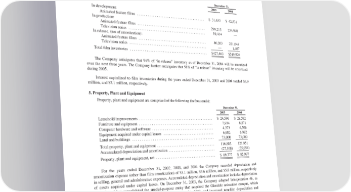 DREAMWORKSANIMATIONSKG,INC. NOTESTOCONSOLIDATEDFINANCIALSTATEMENTS—(Continued) 4. Film Inventories Thefollowing is an analysis of film inventories (in thousands): December31, 2003 2004 In development: Animated feature films ....................................... $31,633 $ 42,531 In production: Animated feature films ....................................... 299,213 254,940 Television series ............................................ 10,414 — In release, (net of amortization): Animated feature films ....................................... 86,203 221,048 Television series ............................................ — 1,407 Total film inventories ............................................ $427,463 $519,926 The Company anticipates that 94% of “in release” inventory as of December 31, 2004 will be amortized over the next three years. The Company further anticipates that 58% of “in release” inventory will be amortized during 2005. Interest capitalized to film inventories during the years ended December 31, 2003 and 2004 totaled $6.9 million, and $7.1 million, respectively. 5. Property, Plant and Equipment Property, plant and equipment are comprised of the following (in thousands): December31, 2003 2004 Leasehold improvements .......................................... $24,596 $ 28,592 Furniture and equipment .......................................... 7,934 8,871 Computer hardware and software ................................... 4,373 4,506 Equipment acquired under capital leases ............................. 6,982 6,982 Landandbuildings .............................................. 73,000 73,000 Total property, plant and equipment ................................. 116,885 121,951 Accumulated depreciation and amortization ........................... (27,108) (35,954) Property, plant and equipment, net .................................. $89,777 $ 85,997 For the years ended December 31, 2002, 2003, and 2004 the Company recorded depreciation and amortization expense (other than film amortization) of $3.1 million, $3.6 million, and $5.8 million, respectively in selling, general and administrative expenses. Accumulated depreciation and amortization includes depreciation of assets acquired under capital leases. On December 31, 2003, the Company adopted Interpretation 46, as revised, and has consolidated the special-purpose entity that acquired the Glendale animation campus, which increased property, plant and equipment as of December 31, 2003, and increased non-film depreciation and amortization after December 31, 2003 (see Note 6). 6. Financing Arrangements (a) Debt Allocated by DreamWorks Studios. Prior to the Separation, DreamWorks Studios historically allocated its debt and related interest to the Company based on the proportion of the Company’s capital invested 83