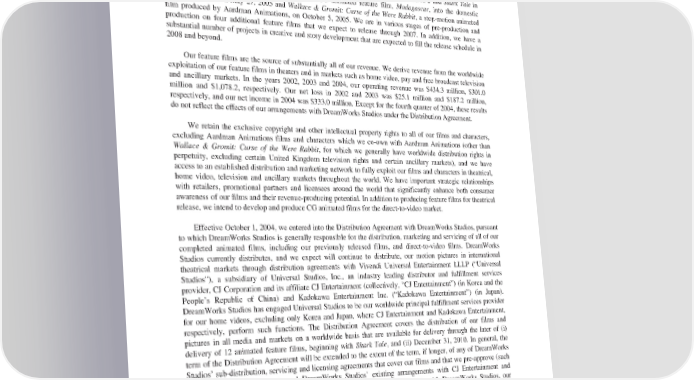 in revenue). The average domestic box office performance of our CG animated films has been significantly higher than that of our hand-drawn, two dimensional feature films. We do not have any hand-drawn, two dimensional films currently in production and do not intend to produce any such films. Webelieve our experience, creative talent, scale of operations, technology and animation proficiency enable us to release two high quality CG animated feature films per year. We released both Shrek 2 and Shark Tale in 2004, and we are scheduled to release our next CG animated feature film, Madagascar, into the domestic theatrical market on May 27, 2005 and Wallace & Gromit: Curse of the Were Rabbit, a stop-motion animated film produced by Aardman Animations, on October 5, 2005. We are in various stages of pre-production and production on four additional feature films that we expect to release through 2007. In addition, we have a substantial number of projects in creative and story development that are expected to fill the release schedule in 2008 and beyond. Our feature films are the source of substantially all of our revenue. We derive revenue from the worldwide exploitation of our feature films in theaters and in markets such as home video, pay and free broadcast television and ancillary markets. In the years 2002, 2003 and 2004, our operating revenue was $434.3 million, $301.0 million and $1,078.2, respectively. Our net loss in 2002 and 2003 was $25.1 million and $187.2 million, respectively, and our net income in 2004 was $333.0 million. Except for the fourth quarter of 2004, these results do not reflect the effects of our arrangements with DreamWorks Studios under the Distribution Agreement. We retain the exclusive copyright and other intellectual property rights to all of our films and characters, excluding Aardman Animations films and characters which we co-own with Aardman Animations (other than Wallace & Gromit: Curse of the Were Rabbit, for which we generally have worldwide distribution rights in perpetuity, excluding certain United Kingdom television rights and certain ancillary markets), and we have access to an established distribution and marketing network to fully exploit our films and characters in theatrical, home video, television and ancillary markets throughout the world. We have important strategic relationships with retailers, promotional partners and licensees around the world that significantly enhance both consumer awareness of our films and their revenue-producing potential. In addition to producing feature films for theatrical release, we intend to develop and produce CG animated films for the direct-to-video market. Effective October 1, 2004, we entered into the Distribution Agreement with DreamWorks Studios, pursuant to which DreamWorks Studios is generally responsible for the distribution, marketing and servicing of all of our completed animated films, including our previously released films, and direct-to-video films. DreamWorks Studios currently distributes, and we expect will continue to distribute, our motion pictures in international theatrical markets through distribution agreements with Vivendi Universal Entertainment LLLP (“Universal Studios”), a subsidiary of Universal Studios, Inc., an industry leading distributor and fulfillment services provider, CJ Corporation and its affiliate CJ Entertainment (collectively, “CJ Entertainment”) (in Korea and the People’s Republic of China) and Kadokawa Entertainment Inc. (“Kadokawa Entertainment”) (in Japan). DreamWorks Studios has engaged Universal Studios to be our worldwide principal fulfillment services provider for our home videos, excluding only Korea and Japan, where CJ Entertainment and Kadokawa Entertainment, respectively, perform such functions. The Distribution Agreement covers the distribution of our films and pictures in all media and markets on a worldwide basis that are available for delivery through the later of (i) delivery of 12 animated feature films, beginning with Shark Tale, and (ii) December 31, 2010. In general, the term of the Distribution Agreement will be extended to the extent of the term, if longer, of any of DreamWorks Studios’ sub-distribution, servicing and licensing agreements that cover our films and that we pre-approve (such as the Universal Agreements and DreamWorks Studios’ existing arrangements with CJ Entertainment and Kadokawa Entertainment). Even if we terminate our distribution relationship with DreamWorks Studios, our existing and future films generally will be subject to the terms of those pre-approved agreements. We retain the copyrights and other intellectual property related to our films and the right to directly exploit certain ancillary rights, such as commercial tie-ins and promotions, literary publishing, music publishing, soundtrack, radio, legitimate stage and merchandising rights. We believe our relationship with DreamWorks Studios provides us with many advantages, including the ability to create consumer awareness and demand for our films through 2