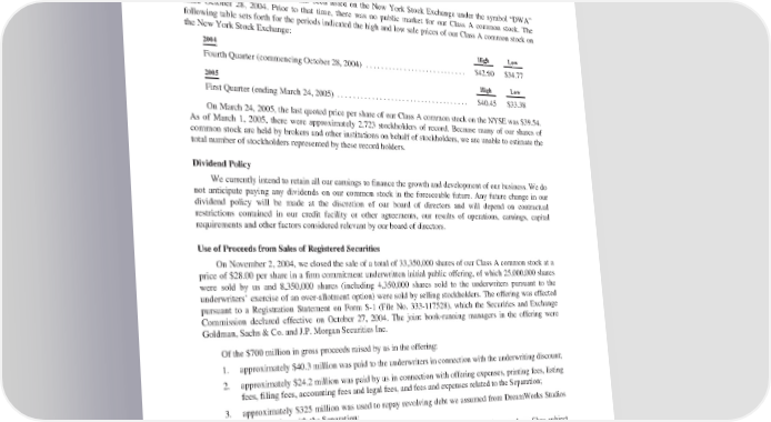 PARTII Item 5. MarketforRegistrant’s CommonEquity,RelatedStockholder Matters andIssuer Purchases of Equity Securities. MarketPriceofOurClassACommonStock Our Class A common stock has been listed on the New York Stock Exchange under the symbol “DWA” since October 28, 2004. Prior to that time, there was no public market for our Class A common stock. The following table sets forth for the periods indicated the high and low sale prices of our Class A common stock on the New York Stock Exchange: 2004 High Low Fourth Quarter (commencing October 28, 2004) ........................... $42.60 $34.77 2005 High Low First Quarter (ending March 24, 2005) ................................... $40.45 $33.38 OnMarch24,2005, the last quoted price per share of our Class A common stock on the NYSE was $39.54. As of March 1, 2005, there were approximately 2,723 stockholders of record. Because many of our shares of commonstock are held by brokers and other institutions on behalf of stockholders, we are unable to estimate the total number of stockholders represented by these record holders. Dividend Policy Wecurrently intend to retain all our earnings to finance the growth and development of our business. We do not anticipate paying any dividends on our common stock in the foreseeable future. Any future change in our dividend policy will be made at the discretion of our board of directors and will depend on contractual restrictions contained in our credit facility or other agreements, our results of operations, earnings, capital requirements and other factors considered relevant by our board of directors. UseofProceedsfromSalesofRegistered Securities OnNovember 2, 2004, we closed the sale of a total of 33,350,000 shares of our Class A common stock at a price of $28.00 per share in a firm commitment underwritten initial public offering, of which 25,000,000 shares were sold by us and 8,350,000 shares (including 4,350,000 shares sold to the underwriters pursuant to the underwriters’ exercise of an over-allotment option) were sold by selling stockholders. The offering was effected pursuant to a Registration Statement on Form S-1 (File No. 333-117528), which the Securities and Exchange Commission declared effective on October 27, 2004. The joint book-running managers in the offering were Goldman, Sachs & Co. and J.P. Morgan Securities Inc. Ofthe $700 million in gross proceeds raised by us in the offering: 1. approximately $40.3 million was paid to the underwriters in connection with the underwriting discount; 2. approximately $24.2 million was paid by us in connection with offering expenses, printing fees, listing fees, filing fees, accounting fees and legal fees, and fees and expenses related to the Separation; 3. approximately $325 million was used to repay revolving debt we assumed from DreamWorks Studios in connection with the Separation; 4. approximately $101.4 million was used to repay revolving debt we incurred to purchase films subject to the DreamWorks Studios film securitization facility; 5. approximately $30 million was used to repay debt that we assumed with respect to DreamWorks Studios’ subordinated obligations to Home Box Office, Inc.; and 6. approximately $179.1 million was used for general corporate purposes, including for working capital. 39