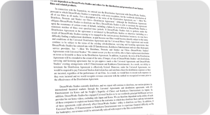required, and may continue to be required, to expand our employee base, increase capital expenditures and procure additional resources and facilities in order to accomplish the scheduled releases of our animated feature films. This growth and expansion has placed, and continues to place, a significant strain on our resources. We cannot provide any assurances that any of our animated feature films will be released as targeted or that this strain on resources will not have a material adverse effect on our business, financial condition or results of operations. WearedependentonDreamWorksStudiosandothersforthedistributionandpromotionofourfeature films and related products. In connection with the Separation, we entered into the Distribution Agreement with DreamWorks Studios, pursuant to which DreamWorks Studios is responsible, with some exceptions, for the worldwide distribution of all of our films in all media. For a description of the terms of the Distribution Agreement, see “—How We Distribute, Promote and Market our Films—Distribution Agreement.” Although the Distribution Agreement obligates DreamWorks Studios to distribute our films, DreamWorks Studios is able to terminate the agreement upon the occurrence of certain events of default, including a failure by us to deliver to DreamWorks Studios a minimum number of films over specified time periods. If DreamWorks Studios fails to perform under the Distribution Agreement or the agreement is terminated by DreamWorks Studios or otherwise (including as a result of DreamWorks Studios ceasing to be engaged in the motion picture distribution business), we may have difficulty finding a replacement distributor, in part because our films would become directly subject to the terms and conditions of the Universal Distribution Agreement and the Universal Home Video Agreement and would continue to be subject to the terms of the existing sub-distribution, servicing and licensing agreements that DreamWorks Studios has entered into with CJ Entertainment, Kadokawa Entertainment and our other third-party service providers. See “—How We Distribute, Promote and Market our Films—DreamWorks Studios’ Agreements with Universal Studios.” We cannot assure you that we will be able to find a replacement distributor on terms as favorable as those in the Distribution Agreement. In addition, in general, the term of the Distribution Agreement will be extended to the extent of the term, if longer, of any of DreamWorks Studios’ sub-distribution, servicing and licensing agreements that we pre-approve (such as the Universal Agreements and DreamWorks Studios’ existing arrangements with CJ Entertainment and Kadokawa Entertainment). As a result, our ability to terminate the Distribution Agreement is effectively limited. Moreover, under the Universal Agreements, we would be required to pay Universal Studios distribution fees and reimburse them for distribution expenses as they are incurred, regardless of the performance of our films. As a result, we would have to record such expenses as they were incurred and we would recognize revenue consistent with the method we recognized revenue prior to the effectiveness of the Distribution Agreement. DreamWorks Studios currently distributes, and we expect will continue to distribute, our motion pictures in international theatrical markets through the Universal Agreements and distribution agreements with CJ Entertainment (in Korea and the People’s Republic of China) and Kadokawa Entertainment (in Japan). In addition, DreamWorks Studios has engaged Universal Studios to be our worldwide principal fulfillment services provider for our home videos, excluding only Japan and Korea. We are therefore dependent on the ability of each of these companies to exploit our feature films in the territories in which they distribute them and any termination of these agreements could adversely affect DreamWorks Studios’ ability to distribute our films. In addition, if Universal Studios, CJ Entertainment or Kadokawa Entertainment were to experience financial difficulty or file for bankruptcy, our revenue could be substantially reduced with respect to the films in distribution. DreamWorksStudiosprovidesanumberofservicestouspursuanttoaservicesagreement(the“Services Agreement”). If the Services Agreement were terminated, we would be required to replace those services ontermsthatmaybelessfavorabletous. Under the terms of a Services Agreement that we entered into with DreamWorks Studios, DreamWorks Studios provides us with certain accounting, insurance administration, risk management, information systems 26