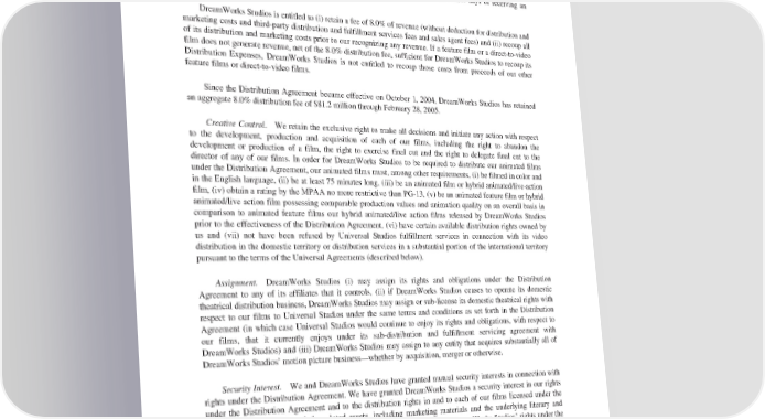Studios otherwise agree, the aggregate amount of Distribution Expenses to be incurred is equal to or greater than 80% of the average amount of Distribution Expenses incurred by DreamWorks Studios to release our four most recent films, subject to certain adjustments. However, if we determine in good faith that a film’s gross receipts will be materially enhanced by the expenditure of additional Distribution Expenses, we may cause DreamWorks Studios to increase such expenditures, provided that we will be solely responsible for advancing to or reimbursing DreamWorks Studios for those additional expenditures within five business days of receiving an invoice from DreamWorks Studios. DreamWorksStudios is entitled to (i) retain a fee of 8.0% of revenue (without deduction for distribution and marketing costs and third-party distribution and fulfillment services fees and sales agent fees) and (ii) recoup all of its distribution and marketing costs prior to our recognizing any revenue. If a feature film or a direct-to-video film does not generate revenue, net of the 8.0% distribution fee, sufficient for DreamWorks Studios to recoup its Distribution Expenses, DreamWorks Studios is not entitled to recoup those costs from proceeds of our other feature films or direct-to-video films. Since the Distribution Agreement became effective on October 1, 2004, DreamWorks Studios has retained an aggregate 8.0% distribution fee of $81.2 million through February 28, 2005. Creative Control. Weretain the exclusive right to make all decisions and initiate any action with respect to the development, production and acquisition of each of our films, including the right to abandon the development or production of a film, the right to exercise final cut and the right to delegate final cut to the director of any of our films. In order for DreamWorks Studios to be required to distribute our animated films under the Distribution Agreement, our animated films must, among other requirements, (i) be filmed in color and in the English language, (ii) be at least 75 minutes long, (iii) be an animated film or hybrid animated/live-action film, (iv) obtain a rating by the MPAA no more restrictive than PG-13, (v) be an animated feature film or hybrid animated/live action film possessing comparable production values and animation quality on an overall basis in comparison to animated feature films our hybrid animated/live action films released by DreamWorks Studios prior to the effectiveness of the Distribution Agreement, (vi) have certain available distribution rights owned by us and (vii) not have been refused by Universal Studios fulfillment services in connection with its video distribution in the domestic territory or distribution services in a substantial portion of the international territory pursuant to the terms of the Universal Agreements (described below). Assignment. DreamWorks Studios (i) may assign its rights and obligations under the Distribution Agreement to any of its affiliates that it controls, (ii) if DreamWorks Studios ceases to operate its domestic theatrical distribution business, DreamWorks Studios may assign or sub-license its domestic theatrical rights with respect to our films to Universal Studios under the same terms and conditions as set forth in the Distribution Agreement (in which case Universal Studios would continue to enjoy its rights and obligations, with respect to our films, that it currently enjoys under its sub-distribution and fulfillment servicing agreement with DreamWorks Studios) and (iii) DreamWorks Studios may assign to any entity that acquires substantially all of DreamWorksStudios’ motion picture business—whether by acquisition, merger or otherwise. Security Interest. WeandDreamWorks Studios have granted mutual security interests in connection with rights under the Distribution Agreement. We have granted DreamWorks Studios a security interest in our rights under the Distribution Agreement and to the distribution rights in and to each of our films licensed under the Distribution Agreement and the related assets, including marketing materials and the underlying literary and music materials, in order to secure the performance of our obligations and DreamWorks Studios’ rights under the Distribution Agreement. DreamWorks Studios has granted us a security interest in its distribution rights to each of our films licensed under the Distribution Agreement and its rights to, among other assets, (i) the gross revenues, (ii) distribution fees, (iii) distribution expenses and (iv) the marketing materials from our films. We each expect to enter into interparty agreements with secured lenders under our respective revolving credit agreements as well. 11