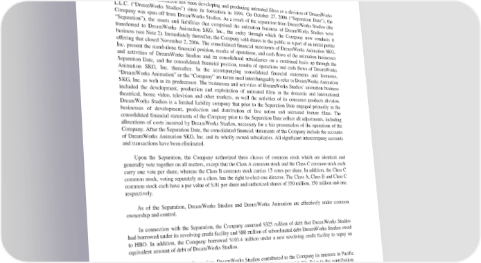 DREAMWORKSANIMATIONSKG,INC. NOTESTOCONSOLIDATEDFINANCIALSTATEMENTS 1. Organization and Summary of Significant Accounting Policies Basis of Presentation and Business DreamWorks Animation has been developing and producing animated films as a division of DreamWorks L.L.C. (“DreamWorks Studios”) since its formation in 1994. On October 27, 2004 (“Separation Date”), the Company was spun off from DreamWorks Studios. As a result of the separation from DreamWorks Studios (the “Separation”), the assets and liabilities that comprised the animation business of DreamWorks Studios were transferred to DreamWorks Animation SKG, Inc., the entity through which the Company now conducts it business (see Note 2). Immediately thereafter, the Company sold shares to the public as a part of an initial public offering that closed November 2, 2004. The consolidated financial statements of DreamWorks Animation SKG, Inc. present the stand-alone financial position, results of operations, and cash flows of the animation businesses and activities of DreamWorks Studios and its consolidated subsidiaries on a combined basis up through the Separation Date, and the consolidated financial position, results of operations and cash flows of DreamWorks Animation SKG, Inc. thereafter. In the accompanying consolidated financial statements and footnotes, “DreamWorks Animation” or the “Company” are terms used interchangeably to refer to DreamWorks Animation SKG, Inc. as well as its predecessor. The businesses and activities of DreamWorks Studios’ animation business included the development, production and exploitation of animated films in the domestic and international theatrical, home video, television and other markets, as well the activities of its consumer products division. DreamWorks Studios is a limited liability company that prior to the Separation Date engaged primarily in the businesses of development, production and distribution of live action and animated feature films. The consolidated financial statements of the Company prior to the Separation Date reflect all adjustments, including allocations of costs incurred by DreamWorks Studios, necessary for a fair presentation of the operations of the Company. After the Separation Date, the consolidated financial statements of the Company include the accounts of DreamWorks Animation SKG, Inc. and its wholly owned subsidiaries. All significant intercompany accounts and transactions have been eliminated. Upon the Separation, the Company authorized three classes of common stock which are identical and generally vote together on all matters, except that the Class A common stock and the Class C common stock each carry one vote per share, whereas the Class B common stock carries 15 votes per share. In addition, the Class C commonstock, voting separately as a class, has the right to elect one director. The Class A, Class B and Class C commonstockeachhaveaparvalueof$.01per share and authorized shares of 350 million, 150 million and one, respectively. As of the Separation, DreamWorks Studios and DreamWorks Animation are effectively under common ownership and control. In connection with the Separation, the Company assumed $325 million of debt that DreamWorks Studios had borrowed under its revolving credit facility and $80 million of subordinated debt DreamWorks Studios owed to HBO. In addition, the Company borrowed $101.4 million under a new revolving credit facility to repay an equivalent amount of debt of DreamWorks Studios. In connection with the Separation, DreamWorks Studios contributed to the Company its interests in Pacific Data Images, Inc. (“PDI”) and its subsidiary, Pacific Data Images LLC (“PDI LLC”). Prior to the contribution, PDI was an approximately a 90% owned subsidiary of DreamWorks Studios. PDI’s sole asset was its 60% ownership interest in PDI LLC. The remaining 40% interest in PDI LLC was owned directly by DreamWorks Studios. As part of the contribution, DreamWorks Studios contributed its 40% interest in PDI LLC to the Company in exchange for shares of Class A Common stock of the Company. Both DreamWorks Studios and the minority stockholders of PDI received shares of the Company’s Class A common stock pursuant to the merger. 71