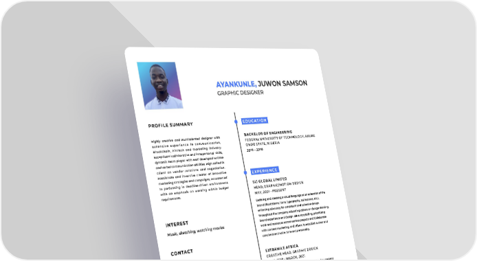 A Y ANK UNLE , JUW ON SAMSON GRAP HIC DESIGNER P R O F I L E S U M M A R Y H i g h l y c r e a t i v e a n d m u l t i t a l e n t e d d e s i g n e r w i t h e x t e n s i v e e x p e r i e n c e i n c o m m u n i c a t i o n , B l o c k c h a i n , F i n T e c h a n d m a r k e t i n g i n d u s t r y . E x c e p t i o n a l c o l l a b o r a t i v e a n d i n t e r p e r s o n a l s k i l l s , d y n a m i c t e a m p l a y e r w i t h w e l l d e v e l o p e d w r i t t e n a n d v e r b a l c o m m u n i c a t i o n a b i l i t i e s . H i g h s k i l l e d i n c l i e n t a n v e n d o r r e l a t i o n s a n d n e g o t i a t i o n . P a s s i o n a t e a n d i n v e n t i v e c r e a t o r o f i n n o v a t i v e m a r k e t i n g s t r a t e g i e s a n d c a m p a i g n s , a c c u s t o m e d t o p e r f o r m i n g i n d e a d l i n e - d r i v e n e n v i r o n m e n t s w i t h a n e m p h a s i s o n w o r k i n g w i t h i n b u d g e t r e q u i r e m e n t s . I N T E R E S T C O N T A C T E ay ank unlejuw on@gmail. c om n + 234 - 7 06 518 53 7 1 l w w w .link edin. c om/ in/ ay ank unle -juw on -5aa32 aa No . 5, Uphill quar t ers, Moniy a, Ibadan, Oy o st at e, Nigeria. E D U C A T I O N B A C H E L O R O F E N G I N E E R I N G F E D E R A L U N I V E R S I T Y O F T E C H N O L O G Y , A K U R E , O N D O S T A T E , N I G E R I A 2 0 1 3 - 2 0 1 8 E X P E R I E N C E S I J G L O B A L L I M I T E D H E A D , G R A P H I C / M O T I O N D E S I G N M A Y , 2 0 2 1 - P R E S E N T D e fi n i n g a n d c re a t i n g a v i s u a l l a n g u a g e a s a n e x t e n s i o n o f t h e b ra n d ( i l l u s t ra t i o n s , i co n s , ty p o g ra p hy , a n i m a t i o n s , e t c . ) , e n fo rc i n g a d v o c a cy fo r co n s i s t e n t a n d co h e s i v e d e s i g n t h ro u g h o u t t h e co m pa ny , e d u c a t i n g o t h e rs o n d e s i g n t h i n ki n g , b ra n d e x p e ri e n ce a n d d e s i g n - d ri v e s t o r y t e l l i n g , p ri o ri t i z i n g w o rk a n d re s o u rce s a c ro s s v a ri o u s p ro j e c t s a n d C o l l a b o ra t e w i t h co n t e n t m a rk e t i n g , a n d o t h e rs , t o e s t a b l i s h a cl e a r a n d co n c i s e b ra n d v o i ce , t o n e a n d p e rs o n a l i ty . E X T R A M I L E A F R I C A C R E A T I V E H E A D , G R A P H I C D E S I G N J U L Y , 2 0 1 8 - M A R C H , 2 0 2 1 W o rk w i t h b ra n d t e a m t o p ro d u ce a n ew i d e a fo r co m pa ny b ra n d i n g , p ro m o t i o n a l c a m pa i g n s a n d m a rk e t i n g , a s s i s t cl i e n t s i n re s o l v i n g i s s u e s b y re s p o n d i n g t o q u e s t i o n s i n t i m e l y a n d p ro fe s s i o n a l m a n n e r, d i re c t b ra i n s t o rm i n g m e e t i n g s a n d c re a t i v e s e s s i o n s , s h a p e b ra n d s t a n d a rd s a n d c re a t e p ro ce d u re s t o e n s u re a l l p ro d u c t s a re b ra n d a p p ro p ri a t e a n d s u p e r v i s e t h e d e pa r t m e n t ' s d a i l y w o rk fl o w , a s s i g n p ro j e c t w o rk l oa d a n d m o n i t o r d e a d l i n e s a n d b u d g e t s . S K I L L S P H O T O S H O P I L L U S T R A T O R C O R E L D R A W B L E N D E R A F T E R E F F E C T W O R D Music , sk et ching, w at ching mo vies