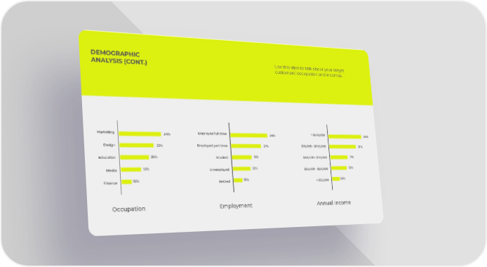 DEMOGRAPHIC Use this slide to talk about your target ANALYSIS (CONT.) customers’ occupation and incomes. Marketing Employed full time > $100,000 34% 34% 34% Design 23% Employed part time 21% $75,000 - $100,000 21% 20% 11% 11% Education Student $50,000 - $70,000 13% 13% 13% Media Unemployed $25,000 - $50,000 10% 10% 10% Finance Retired < $25,000 Occupation Employment Annual Income