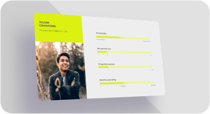 JULIAN CRAWFORD 24 years old / California, USA Personality Introverted Extroverted Household size 1 2 10 Properties owned 2 20 Monthly spending 1 $2,000 $10,000