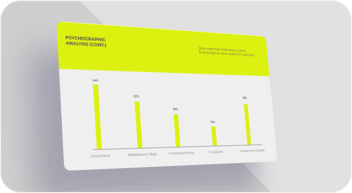 PSYCHOGRAPHIC Show data from interview or survey ANALYSIS (CONT.) To shed light on your customer’s spending 34% 22% 18% 16% 10% Social Media Websites and Blogs Friends and family Colleagues Videos and Podcasts