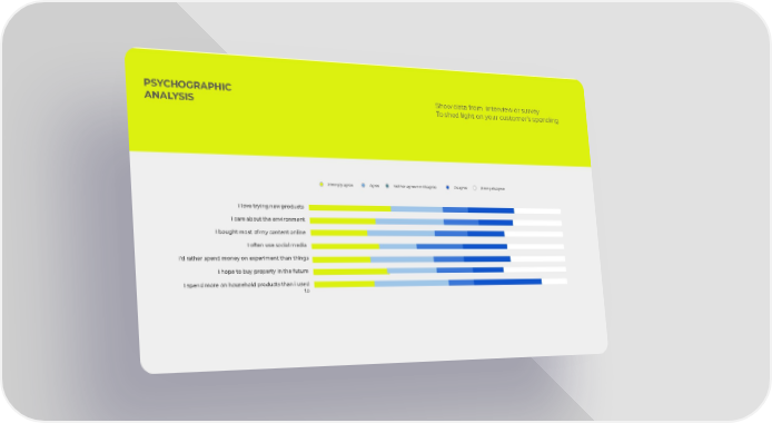 PSYCHOGRAPHIC Show data from interview or survey ANALYSIS To shed light on your customer’s spending Strongly agree Agree Neither agree nor disagree Disagree Strong disagree I love trying new products I care about the environment I bought most of my content online I often use social media I’d rather spend money on experiment than things I hope to buy property in the future I spend more on household products than i used to