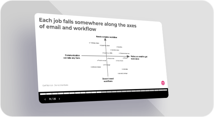 Each job falls somewhere along the axes of email and workflow Needs complex workflow x IT Manager, Bigco x Support rep, Bigco x Recruiting x Insurance broker x Support rep, (SMB) x Professional services Communication Relies on email to get x EA/exec x Supply chain can take any form work done x Product manager x Inbound sales x HR manager x Software Engineer x Field sales x Marketing manager Doesn’t need workflows Confidential - Do not distribute 11 / 25