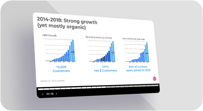 2014-2018: Strong growth (yet mostly organic) ARR Growth Quarterly revenue cohorts User cohorts by join date 2019 2019 2019 Q2’14 Q2’15 Q2’16 Q2’17 Q2’18 Q2’19 Q2’14 Q2’15 Q2’16 Q2’17 Q2’18 Q2’19 Q2’14 Q2’15 Q2’16 Q2’17 Q2’18 Q2’19 +5,500 137% 54% of current Customers net $ Customers users joined in 2019 Confidential - Do not distribute 13 / 25