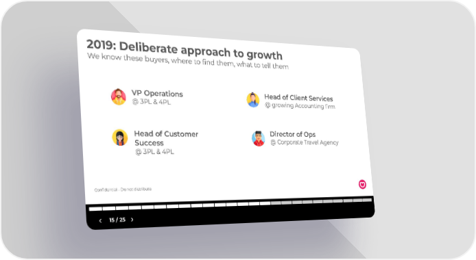 2019: Deliberate approach to growth We know these buyers, where to find them, what to tell them Head of Client Services VP Operations @ growing Accounting firm @ 3PL & 4PL Director of Ops Head of Customer @ Corporate Travel Agency Success @ 3PL & 4PL Confidential - Do not distribute 15 / 25