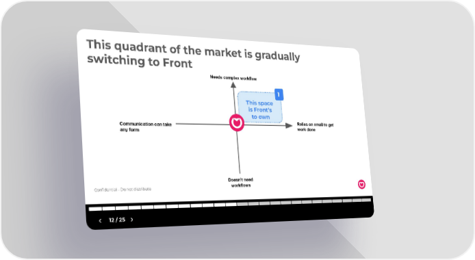This quadrant of the market is gradually switching to Front Needs complex workflow 1 This space is Front’s to own Relies on email to get Communication can take work done any form Doesn’t need workflows Confidential - Do not distribute 12 / 25