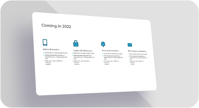 Coming in 2022 Native Biometric Push authentication PIN Creation verification Login with Ethereum Optimized for desktop and mobile Optimized for desktop and mobile Optimized for desktop and mobile Optimized for desktop and mobile Remove passwords entirely or Remove passwords entirely or Remove passwords entirely or Remove passwords entirely or Streamline your “forgot password” Streamline your “forgot password” Streamline your “forgot password” Streamline your “forgot password” flow flow flow flow One-click user invitations + One-click user invitations + One-click user invitations + One-click user invitations + account account account account creation creation creation creation