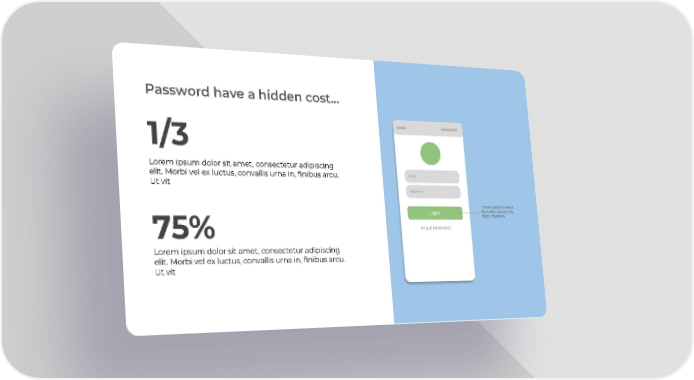 Password have a hidden cost… 1/3 Lorem ipsum dolor sit amet, consectetur adipiscing Email elit. Morbi vel ex luctus, convallis urna in, finibus arcu. Ut vit Password 75% of users that select this button abandon the Login digital interaction Forget Password? 75% Lorem ipsum dolor sit amet, consectetur adipiscing elit. Morbi vel ex luctus, convallis urna in, finibus arcu. Ut vit