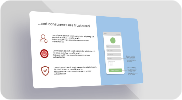 …and consumers are frustrated Lorem ipsum dolor sit amet, consectetur adipiscing elit. Morbi vel ex luctus, convallis urna in, finibus arcu. Ut vitae consectetur quam, semper vulputate nislc Name Email address Lorem ipsum dolor sit amet, consectetur adipiscing elit. Morbi vel ex luctus, convallis urna in, Phone number finibus arcu. Ut vitae consectetur quam, semper Password frustrates vulputate nislc Users, cause drop-off Password And create additional Security overhead and Password requirements Risk for apps Lorem ipsum dolor sit amet, consectetur adipiscing elit. Lorem ipsum dolor sit amet, consectetur adipiscing elit. Lorem ipsum dolor sit amet, consectetur adipiscing elit. Lorem ipsum dolor sit amet, consectetur adipiscing elit. Lorem ipsum dolor sit amet, consectetur adipiscing elit. Lorem ipsum dolor sit amet, consectetur adipiscing elit. 21% of users forget Morbi vel ex luctus, convallis urna in, their passwords within Create Account finibus arcu. Ut vitae consectetur quam, semper 2 weeks of creating them. 78% report vulputate nislc forgetting a Password in the past 90 days