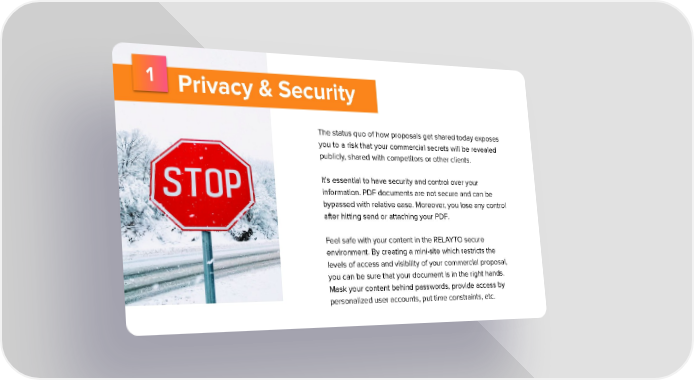 1 Privacy & Security The status quo of how proposals get shared today exposes you to a risk that your commercial secrets will be revealed publicly, shared with competitors or other clients. It's essential to have security and control over your information. PDF documents are not secure and can be bypassed with relative ease. Moreover, you lose any control after hitting send or attaching your PDF. Feel safe with your content in the RELAYTO secure environment. By creating a mini-site which restricts the levels of access and visibility of your commercial proposal, you can be sure that your document is in the right hands. Mask your content behind passwords, provide access by personalized user accounts, put time constraints, etc.