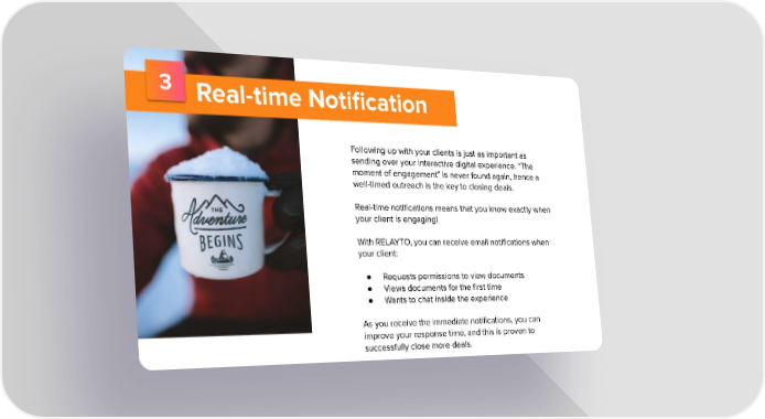 3 Real-time Notification Following up with your clients is just as important as sending over your interactive digital experience. “The moment of engagement” is never found again, hence a well-timed outreach is the key to closing deals. Real-time notifications means that you know exactly when your client is engaging! With RELAYTO, you can receive email notifications when your client: ● Requests permissions to view documents ● Views documents for the first time ● Wants to chat inside the experience As you receive the immediate notifications, you can improve your response time, and this is proven to successfully close more deals.