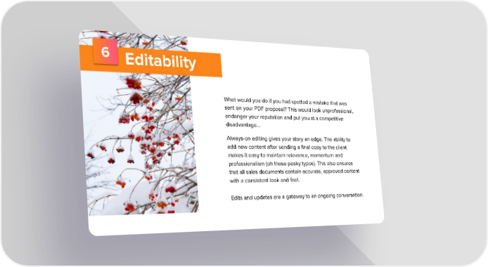 6 Editability What would you do if you had spotted a mistake that was sent on your PDF proposal? This would look unprofessional, endanger your reputation and put you at a competitive disadvantage... Always-on editing gives your story an edge. The ability to add new content after sending a final copy to the client makes it easy to maintain relevance, momentum and professionalism (oh those pesky typos). This also ensures that all sales documents contain accurate, approved content with a consistent look and feel. Edits and updates are a gateway to an ongoing conversation.