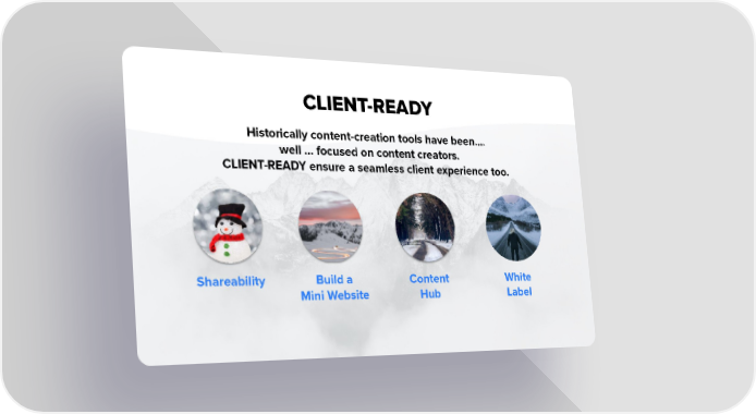 CLIENT-READY Historically content-creation tools have been…. well … focused on content creators. CLIENT-READY ensure a seamless client experience too. Shareability Build a Content White INTERACTIVE Mini Website Hub Label