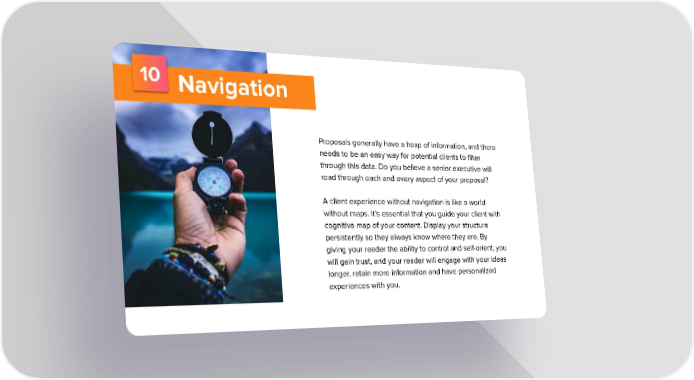 10 Navigation Proposals generally have a heap of information, and there needs to be an easy way for potential clients to filter through this data. Do you believe a senior executive will read through each and every aspect of your proposal? A client experience without navigation is like a world without maps. It’s essential that you guide your client with cognitive map of your content. Display your structure persistently so they always know where they are. By giving your reader the ability to control and self-orient, you will gain trust, and your reader will engage with your ideas longer, retain more information and have personalized experiences with you.