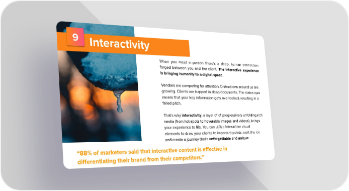 9 Interactivity When you meet in-person there's a deep, human connection forged between you and the client. The interactive experience is bringing humanity to a digital space. Vendors are competing for attention. Distractions around us are growing. Clients are trapped in dead documents. The status quo means that your key information gets overlooked, resulting in a failed pitch. That's why interactivity, a layer of of progressively unfolding rich media (from hot-spots to hoverable images and videos), brings your experience to life. You can utilize interactive visual elements to draw your clients to important points, melt the ice and create a journey that's unforgettable and unique. “88% of marketers said that interactive content is effective in differentiating their brand from their competitors.”