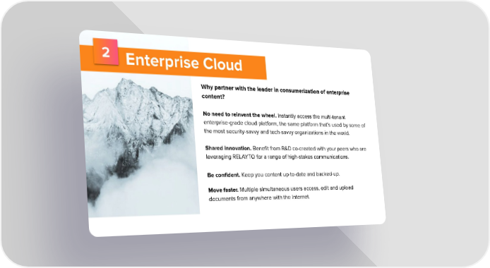 2 Enterprise Cloud Why partner with the leader in consumerization of enterprise content? No need to reinvent the wheel. Instantly access the multi-tenant enterprise-grade cloud platform, the same platform that’s used by some of the most security-savvy and tech-savvy organizations in the world. Shared innovation. Benefit from R&D co-created with your peers who are leveraging RELAYTO for a range of high-stakes communications. Be confident. Keep you content up-to-date and backed-up. Move faster. Multiple simultaneous users access, edit and upload documents from anywhere with the Internet.