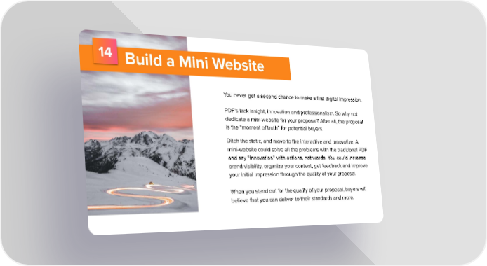 14 Build a Mini Website You never get a second chance to make a first digital impression. PDF’s lack insight, innovation and professionalism. So why not dedicate a mini-website for your proposal? After all, the proposal is the “moment of truth” for potential buyers. Ditch the static, and move to the interactive and innovative. A mini-website could solve all the problems with the traditional PDF and say “innovation” with actions, not words. You could increase brand visibility, organize your content, get feedback and improve your initial impression through the quality of your proposal. When you stand out for the quality of your proposal, buyers will believe that you can deliver to their standards and more.