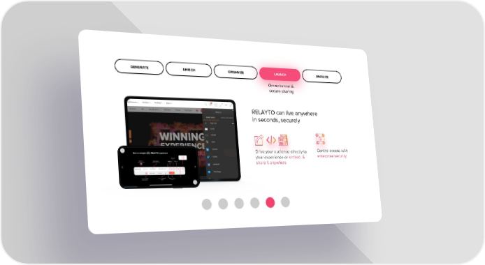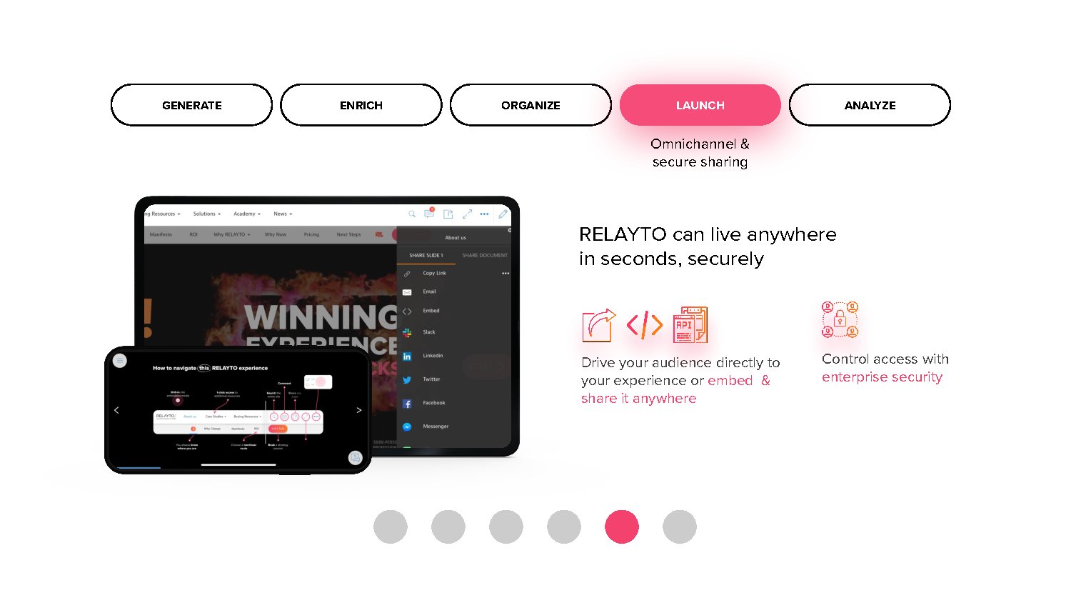 GENERATE ENRICH ORGANIZE LAUNCH ANALYZE Omnichannel & secure sharing RELAYTO can live anywhere in seconds, securely Control access with Drive your audience directly to enterprise security your experience or embed & share it anywhere