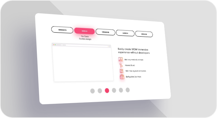 GENERATE ENRICH ORGANIZE LAUNCH ANALYZE No Code flexible design Easily create WOW immersive experience without developers Add any media & animate Interact & act 100+ free styles & templates Self-guided journeys